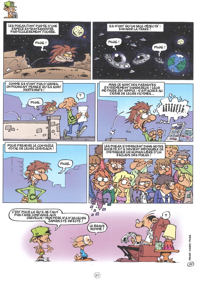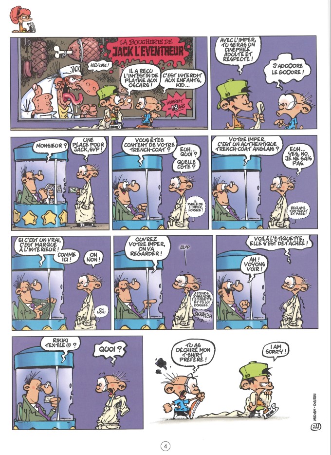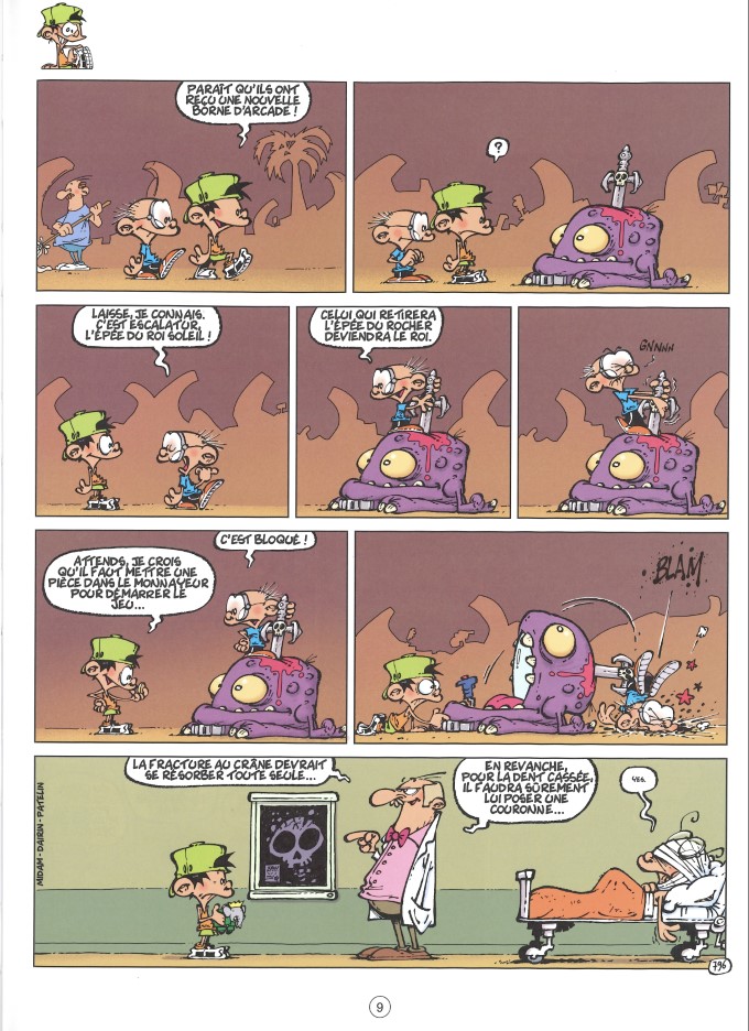 © Midam, Adam, Patelin, BenBK Outre les gags en une planche, il y a ceux en deux, dont la chute pleine case se découvre en tournant la page. Ce sont en fait les chutes les plus imprévisibles qu’il vaut mieux cacher pour ne pas les voir trop tôt ou pour que l’œil ne se pose pas dessus par inadvertance au risque de tout gâcher. C’est poilant.