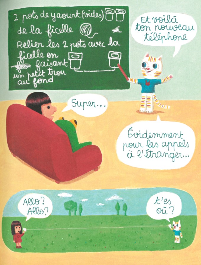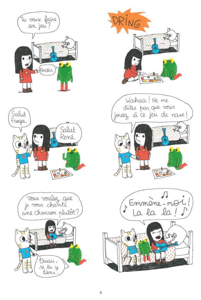 Anna et Froga est une série destinée aux plus petits mais à l’humour si fin que les parents y trouveront aisément leur compte. Le concert au piano des dix vers de terre vaut son pesant de cacahouètes. L’autrice ponctue les très courts récits de saynètes peintes en lien avec l’histoire précédant. Ce couillon de cousin Jason risque d’en avoir mal à la tête. Avec sa petite robe rouge, Anna a un côté Emilie, de Domitille de Pressensé. Mais là où l’héroïne à la capuche reste terre à terre, la copine de Froga vit dans un univers surréaliste qui est une véritable bouffée d’oxygène pour échapper à la morosité.