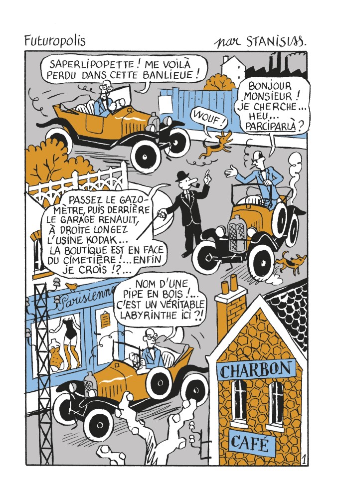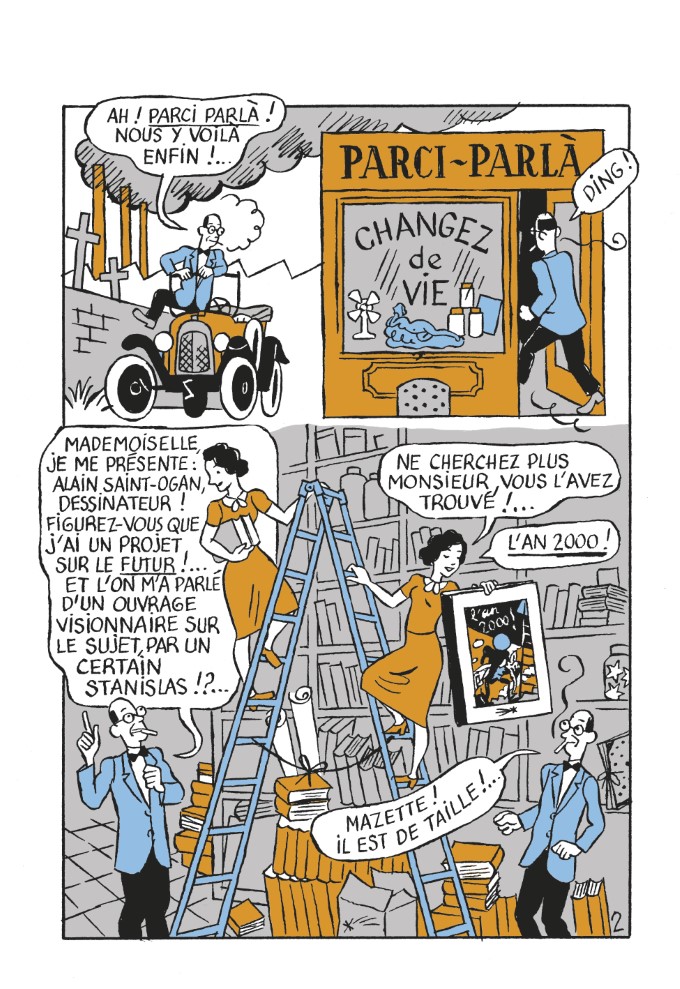 -Mademoiselle, je me présente : Alain Saint-Ogan, dessinateur ! Figurez-vous que j’ai un projet sur le futur !… Et on m’a parlé d’un ouvrage visionnaire sur le sujet par un certain Stanislas !?…
