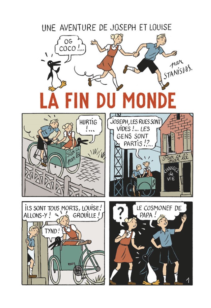 L’album se termine par la seule histoire en couleur, dont Dominique Thomas s’est chargée. Une aventure de Joseph et Louise brouille les pistes entre les univers de Hergé et Saint-Ogan, avec ce sublime méli-mélo de Jo, Zette et Jocko (dont on verra les parents au lit) et de Zig, Puce et Alfred, pingouin iconique récompense des premiers festivals d’Angoulême.