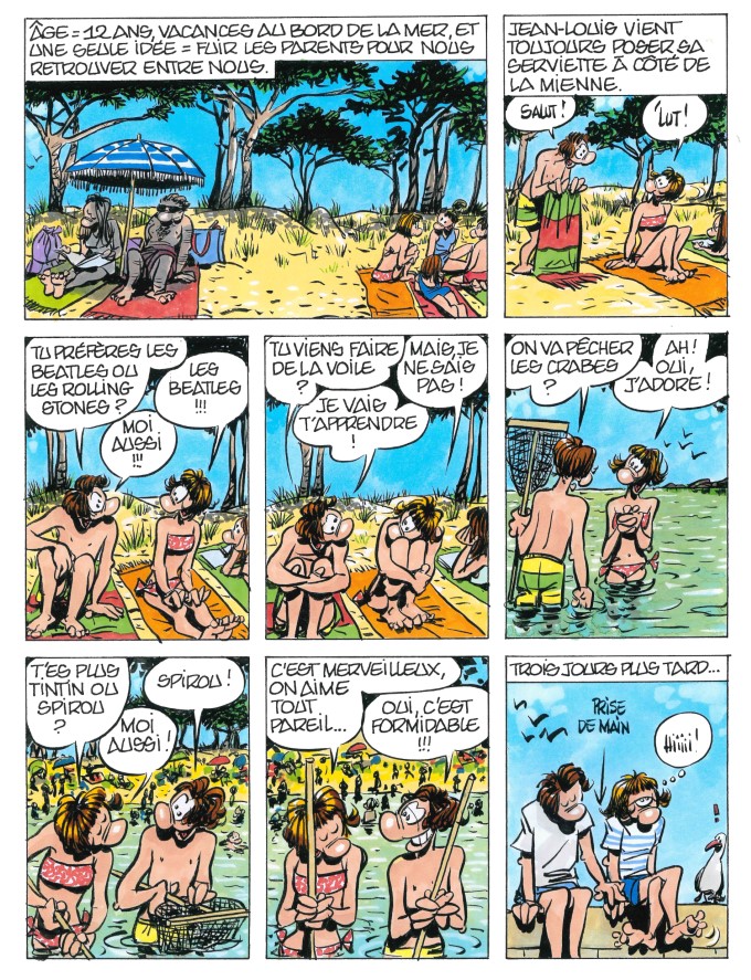 L’album débute par une salve de récits courts. Dès le départ, le ton est posé : Cette année, les garçons seront formidables… T’as qu’à croire ! Pauvre dessinatrice. Quand tout doit changer, rien ne change. Si elle avait su, elle se serait plutôt lancée dans le western ou la science-fiction. On enchaîne avec un joli conte de Noël avant de parler de premier amour, à douze ans, en bord de plage. Rapprochement, regards humides et premier baiser : vois le doux frisson de l’amour qui ne sera pas toujours possible.