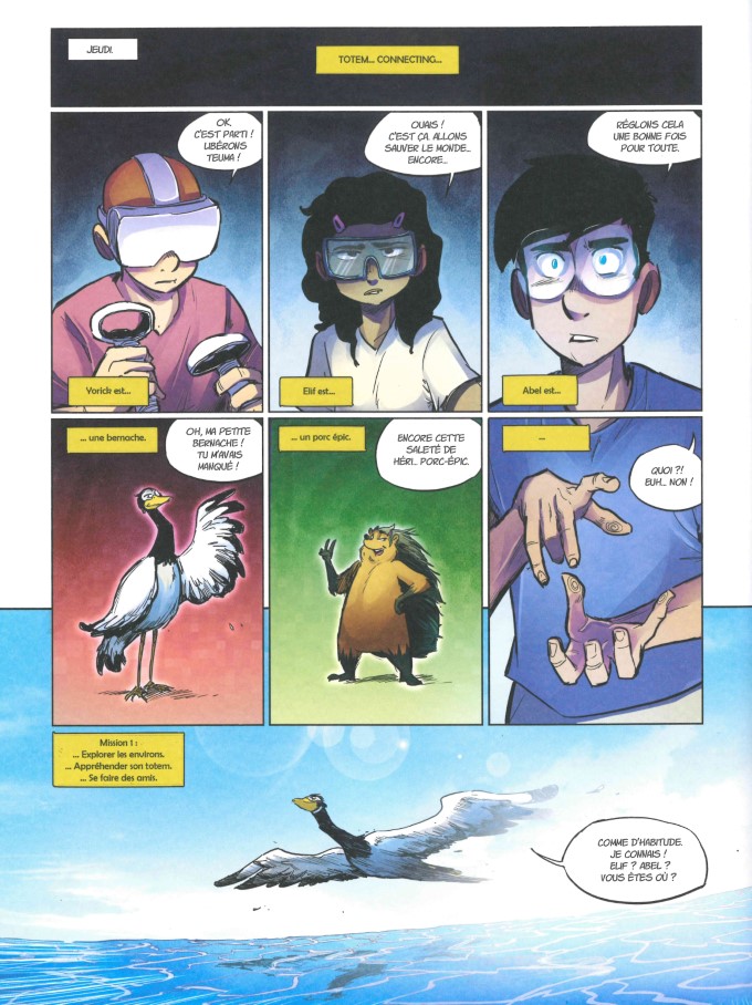 Le professeur Teuma a besoin d’Abel et de sa meilleure équipe. Il n’y a pas beaucoup de temps. Les gamers vont devoir utiliser leurs totems pour libérer le professeur et empêcher que ses connaissances ne tombent entre de mauvaises mains. Préoccupé non pas par sa rupture mais par sa pause dans sa relation avec Roxanne, Abel procrastine devant les jeux vidéos. C’est un événement dramatique, la mort de leur ami Lucien, qui va faire comprendre à Abel qu’il faut se bouger et libérer Teuma. Casques de réalité virtuelle sur les yeux, manettes en main, Yorick a pour avatar une bernache, Elif est un porc-épic, quant à Abel, il s’incarne pour le jeu dans une poule à lunettes. Leur mission : s’infiltrer dans le pénitencier où est détenu le captif.