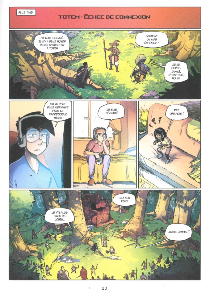 Pour ceux qui ne connaîtraient pas la série, dans Totem, le concept de réalité virtuelle se mêle à une réelle réalité. Les joueurs jouent dans la peau d’animaux qui agissent dans la vraie vie, comme s’ils contrôlaient des animaux à distance. Comme dans l’épisode précédent, nos héros vont au secours du professeur Teuma. S’ils ne peuvent pas mourir dans le jeu, dans la vraie vie d’un gamer, ce n’est pas pareil. On le vit dans l’histoire. Etre adolescent et faire face au deuil, c’est particulièrement bouleversant, parce qu’à cet âge-là, paradoxalement, on se pense invincible, on se croit immortel, et d’un autre côté le moindre grain de sable peut gripper la machine. Les corps se développent, les sentiments changent et se font plus forts.