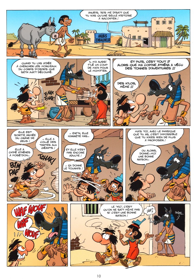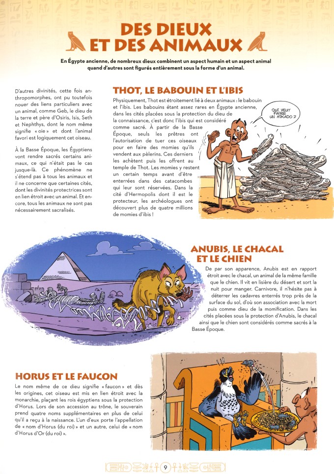 Tout comme en Grèce, les divinités égyptiennes ont des attributs. Osiris porte une couronne blanche et Isis un trône en guise de couvre-chef parce que c’est la signification de son nom. Hercule s’esclaffe. Elle n’est pas passée loin de s’appeler « chaise ». Le dieu Thot, à tête d’Ibis, va raconter à Totor l’histoire d’Osiris, la fois où Seth a voulu se débarrasser de lui en le balançant dans le Nil dans un cercueil. Heureusement que sa sœur Isis l’a retrouvé. Si nos petits mythos regrettent que les égyptiens n’aient pas de labyrinthe, d’hydres, de cyclopes et de cerbères, ils vont apprendre que de nombreuses fables animalières composent leurs légendes. Ils vont également être décomplexés face à la mort qui, pour les égyptiens, n’est qu’une autre étape de la vie.