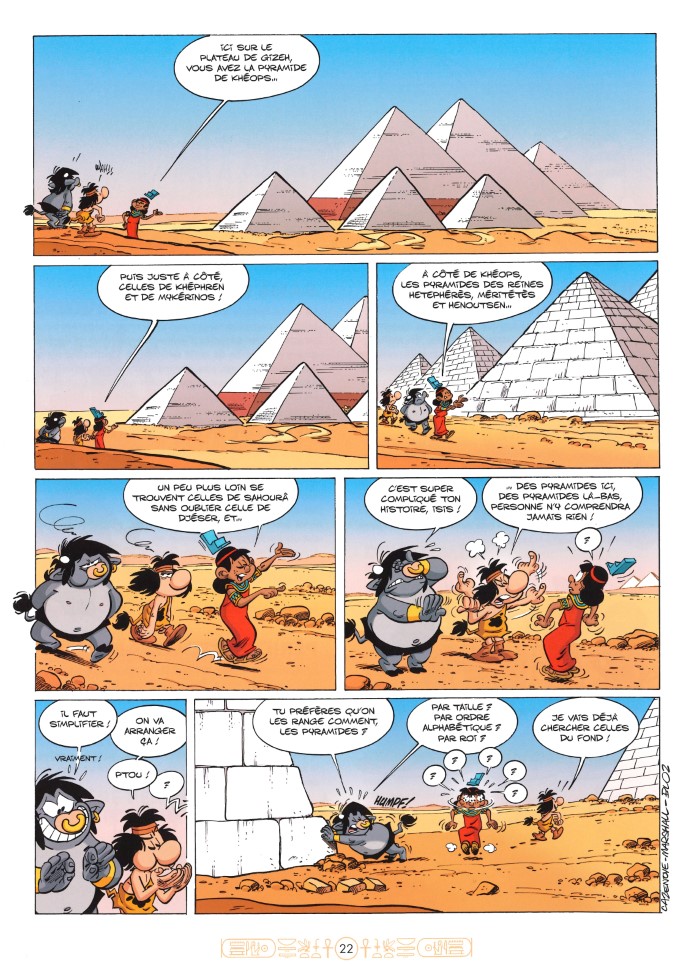 2025, année égyptienne chez Bamboo. En plus de ce hors-série des Petits Mythos, l’éditeur lance la série d’albums jeunesse Petit Chou, signée Amandine Marshall et Nathalie Janer dont les deux premiers albums sont parus en mai. La même scénariste, avec Domas aux dessins, publie un livre de Vrai/Faux sur l’Egypte antique. Ce n’est pas étonnant que ce soit cette même spécialiste qui se soit chargée des textes des Petits Mythos présentent la mythologie égyptienne. Entre les planches de gags et les dessins humoristiques pleines pages, dessinées une fois n’est pas coutume par Bloz et non pas par Larbier, mais toujours scénarisées par Christophe Cazenove, sous l’œil bienveillant d’Amandine Marshall qui raconte tout ou presque sur la civilisation et ses légendes dans des textes illustrés. Cerise sur le gâteau à l’institut du monde arabe à Paris : jusqu’au 11 janvier 2026, le Musée et les éditions Bamboo présentent l’exposition Le Mystère de Cléopâtre, avec des ateliers créatifs imaginés par les auteurs, comme le samedi 27 septembre où l’on pourra, avec l’égyptologue Amandine Marshall, apprendre à déchiffrer les hyéroglyphes et décoder ainsi les secrets des pharaons.