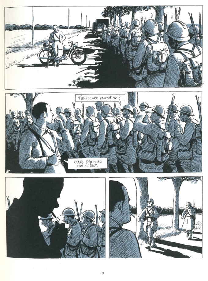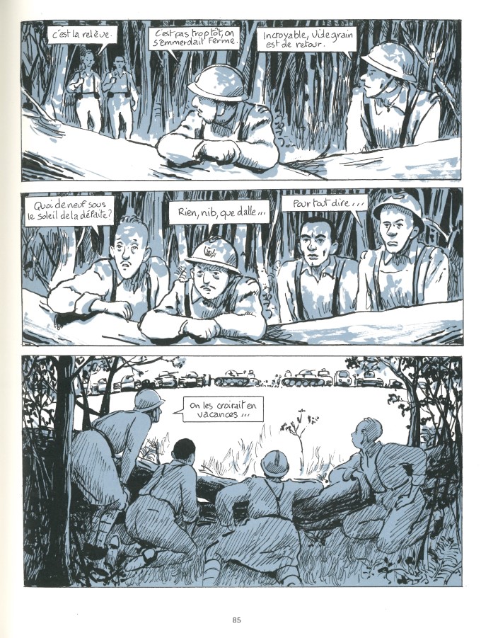 En 1940, les nazis sont en position victorieuse. L’armée française a subi une déconfiture. Des millions de civils sont en exode. Tout est résumé dans une scène muette poignante où les avions allemands bombardent une colonne de civils. Dans une ambiance blanche et noire aux tons bleutés à la Tardi, Pascal Rabaté signe l’un des récits de guerre majeurs en bande dessinée. A l’origine publié sous forme de diptyque, cette intégrale est publiée à l’occasion des 85 ans des événements. Videgrain est un soldat Lambda. C’est vous, c’est moi, c’est Rabaté, c’est l’espoir malgré tout pour paraphraser Emile Bravo. Videgrain n’est pas un héros. Il a un côté lâche, on le verra vers la fin du récit, mais après tout, ses agissements ne sont pas totalement illégitimes. Ne dit-on pas que la guerre est dirigée par les gradés et subie par les soldats ? Alors pourquoi ne pas reprendre sa liberté de penser ?