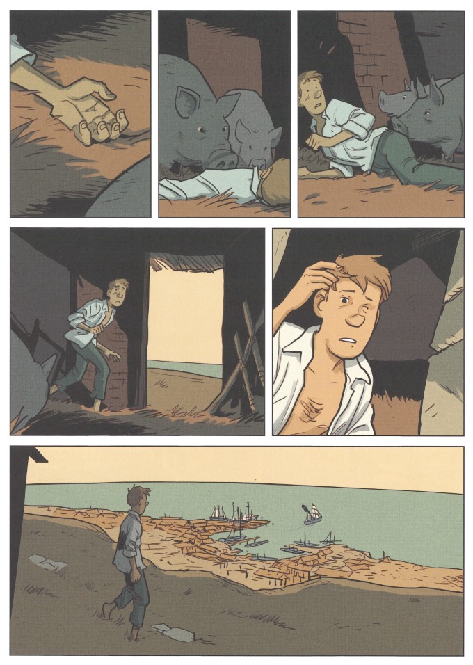 Si l’histoire de Corentin Tréguier se lit comme un feuilleton, c’est parce qu’elle a été conçue comme un feuilleton. Cette histoire, comme la précédente, est issue de la série de podcasts éponyme de France Culture. Dix épisodes, dix chapitres dans l’album, Emmanuel Suarez adapte son récit très dialogué. C’est là que l’on voit que la radio et la bande dessinée se rejoignent dans l’art du dialogue. Il y en a beaucoup ici mais ça se lit avec grande fluidité. Dans Corentin Tréguier, tout passe par les joutes oratoires et la correspondance épistolaire. Il n’y a quasiment aucun récitatif. Avec son dessin d’un réalisme souple, Hamo se classe dans une gamme d’auteurs comme Xavier Fourquemin. Avec des pupilles rondes et fines, Hamo parvient à donner l’état d’esprit et le caractère de chacun des personnages au premier coup d’œil. Il suffit de regarder les portraits de la galerie en fin d’album pour le comprendre.