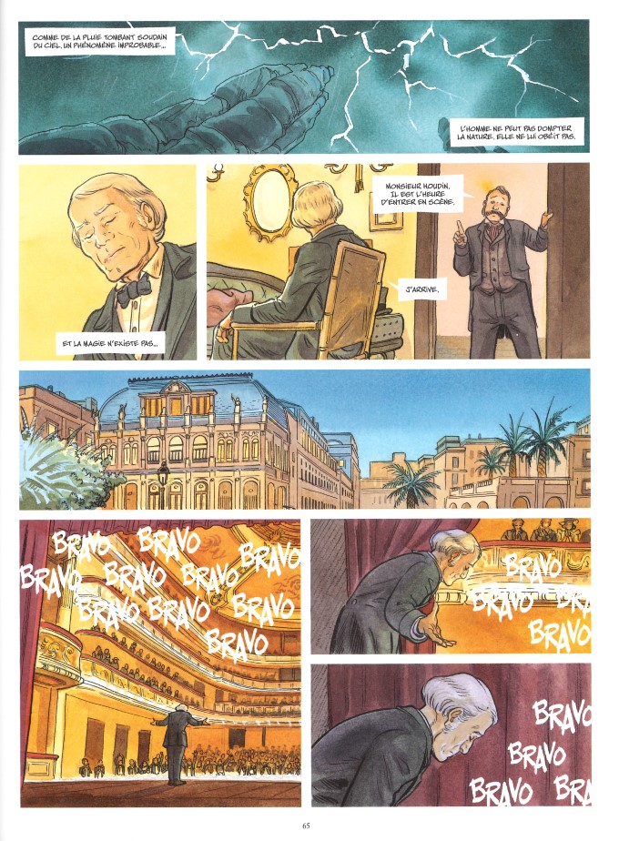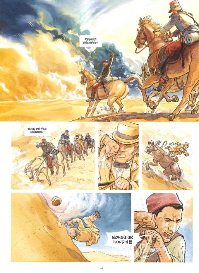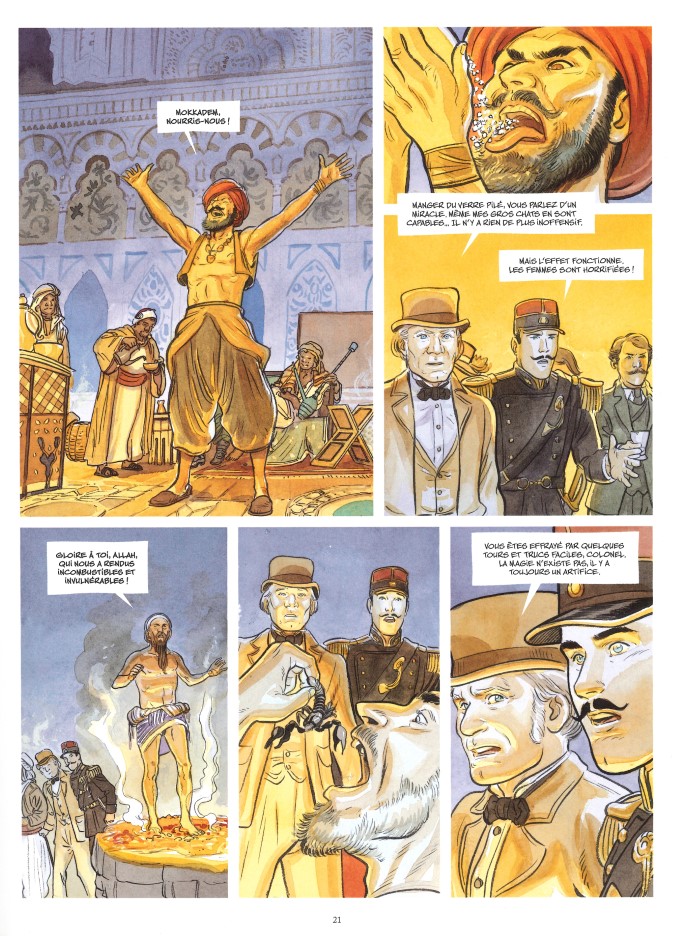 Avec Artifices, les auteurs s’emparent d’une partie méconnue de la vie d’un des fondateurs de l’illusionnisme moderne. En 1856, Jean-Eugène Robert-Houdin a cinquante-et-un ans. Le voilà embarqué dans une entreprise politique au service de l’Etat. Le cahier documentaire en fin d’albums revient sur sa vie en montrant comment le gouvernement français l’a utilisé pour détourner les Arabes des miracles, dixit Charles Baudelaire en personne. On y revient sur le rôle des femmes dans la résistance locale, comme dans l’album avec le personnage de Nélia, inspirée de Lalla Fatma N’Soumer, combattante, stratège et féministe avant l’heure. Comme le conclue le scénariste dans le dossier, toute l’histoire nous invite à nous questionner sur ce que nous croyons voir et savoir dans notre monde saturé d’images. De la scène du théâtre aux dunes du désert, des quartiers chics d’Alger aux traboules de villages kabyles, le dessinateur Julien Ribas invite au voyage.