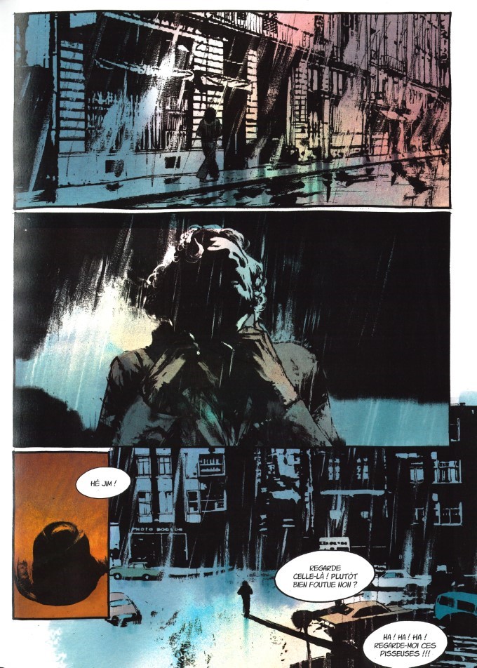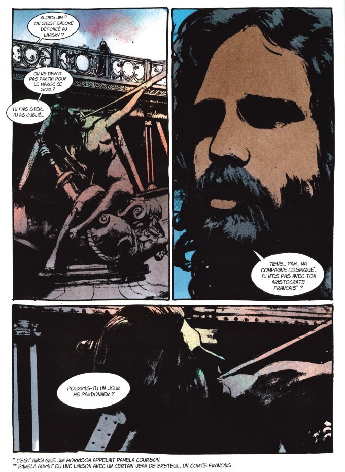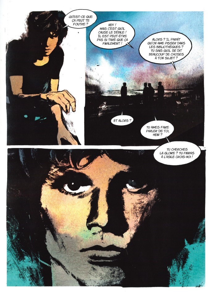 Frédéric Bertocchini propose une version éthérée de la vie de Jim Morrison. Jef adopte un style graphique charbonneux. L’album a déjà été publié en noir et blanc chez Emmanuel Proust en 2010. Sous-titré Poète du chaos, il a été traduit en de nombreuses langues. Pour les éditions Des ronds dans l’O, le dessinateur y a ajouté des couleurs. Les dégradés sombres s’insèrent parfaitement à l’univers et donnent un côté Comics polar qui peint l’âme de Morrison. On pourrait presque ranger le livre aux côtes des thrillers de Sean Phillips et Ed Brubaker.