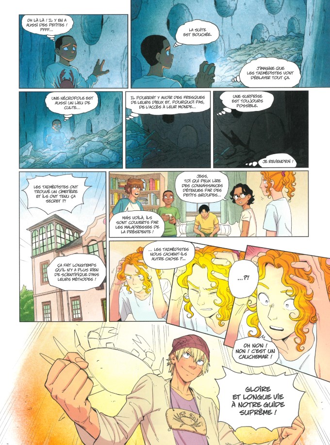 Avec ce sixième épisode, Vincent Dugomier donne un tournant politique à la série. Embrigadement des foules, fanatisme politique, Jimmy pourrait être le fils de Donald Trump et de son vice-président J.D.Vance. Par son pouvoir d’endoctrinement, Jimmy lobotomise la foule. En face, il va falloir revoir les alliances pour contrer la dictature. Les omniscients est beaucoup plus une série psychologique qu’une série d’action. Pas toujours facile pour Renata Castellani de mettre ses capacités en valeur. Ici, elle va en avoir l’occasion, avec l’escalier invisible qui mène au domaine des dieux. Un aperçu en est donné sur la couverture. C’est encore plus impressionnant à l’intérieur.
