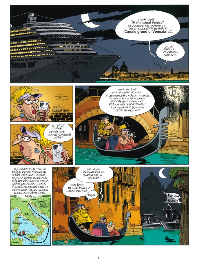 Un couple de touristes n’est pas franchement ravi de son séjour à Venise : des canaux partout, du mal à se repérer sur « gougle maps». La connexion satellite semble déconner. L’agence de voyage ne perd rien pour attendre ! Il leur tarde de retrouver le bateau de croisière qui les a déposés pour l’escale. Malheureusement pour eux, ils vont se retrouver au beau milieu d’une manifestation anti-touriste organisée par des vénitiens excédés de voir leur belle cité des doges envahie par trente millions de touristes chaque année. Ceci est la première des histoires de ce recueil signé Zidrou et Maltaite qui nous fait faire le tour du monde, non pas pour visiter le globe, mais pour se moquer avec plus d’acidité que de tendresse, du tourisme de masse.