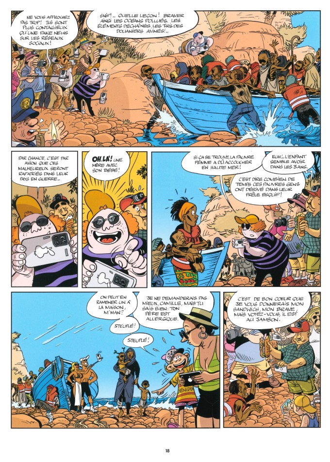 Un safari-photo, une visite de camp de concentration, Bruxelles, New-York, Barcelone, une île paradisiaque, les auteurs ne lésinent pas sur les frais de voyage. Zidrou dénonce le pathétisme des voyages low cost, le ridicule des city trips et l’égocentrisme des réseaux sociaux. Dans les plus belles villes, les locaux ont du fuir le centre pour laisser place aux touristes avec leurs portables et leurs tee-shirts niais. Zidrou n’invente rien. Il lui suffit de grossir à peine un poil le trait pour faire rire. Même le tourisme de catastrophe existe, et ça, ça ferait plutôt pleurer.