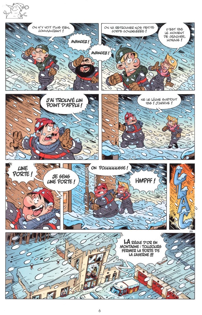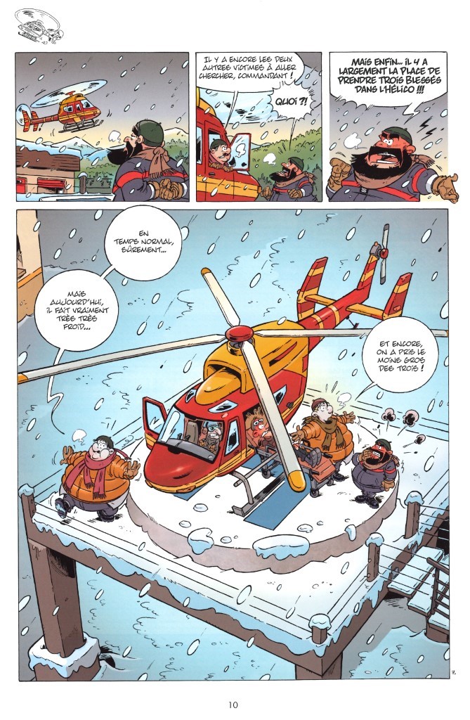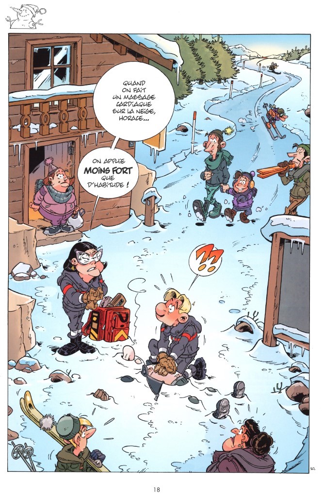 La première partie de l’album se déroule donc dans la neige. La tempête peut survenir à tout moment, c’est pour ça qu’il faut bien refermer la porte de la caserne derrière soi. Il ne faudra pas abuser du klaxon, ça pourrait provoquer des avalanches. On apprendra qu’il y a différents types de neige : humide, verglacée, sèche, mouillée, poudreuse, croûtée. Mais toutes sont bonnes pour des batailles de boules. Les skieurs descendant tout schuss, attention également à l’endroit où l’on gare le fourgon. Dans l’hélico, la place est comptée. Pas question d’y entrer avec de trop grosses doudounes. N’est-ce pas, Horace et Robert ?  Nos pompiers apprendront même à utiliser un chien renifleur pour retrouver des victimes… et pas que.