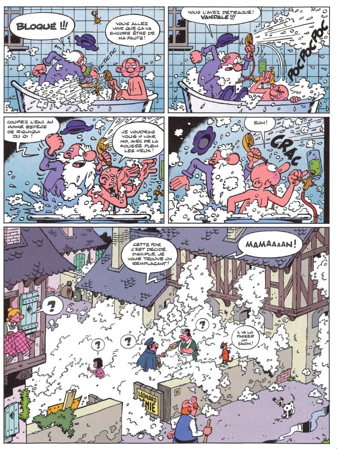 Pendant que le facteur est invité par Mathurine à prendre un petit remontant – Ma foi, c’est si gentiment proposé -, Léonard demande à Disciple de se mettre tout nu dans la baignoire. Mais ? On n’a pas l’habitude de lire ça dans Léonard ? On a vu assez d’horreurs à la guerre ! On ne va quand même pas tomber dans le « Olé olé ». Meuh non… D’abord, on n’a jamais vu quelqu’un prendre sa douche habillé. Et puis, le génie a une nouvelle invention à tester. Ouf ! C’était pour ça. Le savant vient d’imaginer la première douche avec distributeur de gel incorporé grâce au pommeau shampouineur Léonardeau. On va avoir de la mousse plein les yeux, et peut-être même dans le verre du facteur. Ce test n’est que pour la première de toutes les inventions que Léonard va mettre au point dans ce cinquante-sixième album, déjà le dixième scénarisé par Zidrou.