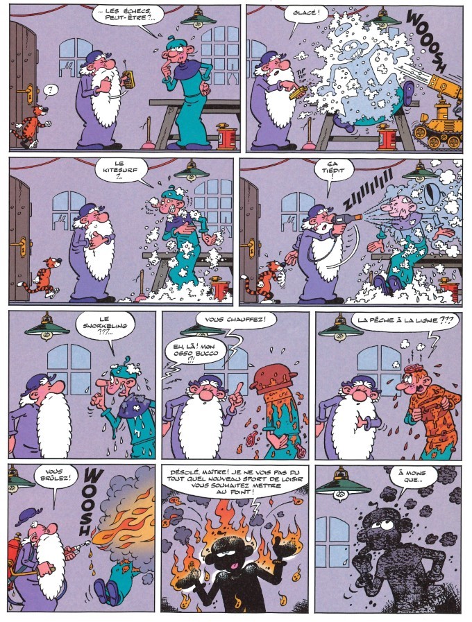 Léonard et Basile, son fidèle et bien (trop ?) dévoué disciple, vérifient que tous les instruments sont en état de marche. Le tromblon, le gant de boxe, le marteau et même l’enclume sont en parfait état de marche. Disciple va pouvoir en prendre encore une fois plein la figure. Nos héros vont pouvoir passer aux choses sérieuses. Pas de temps à perdre, c’est que Léonard à un statut de plus grand génie de l’humanité à défendre, lui. Le disciple, lui, comme d’hab, va servir la science… et c’est sa joie… pardon… f’est fa voie… , parce qu’ils va laisser quelques dents sur le parquet.