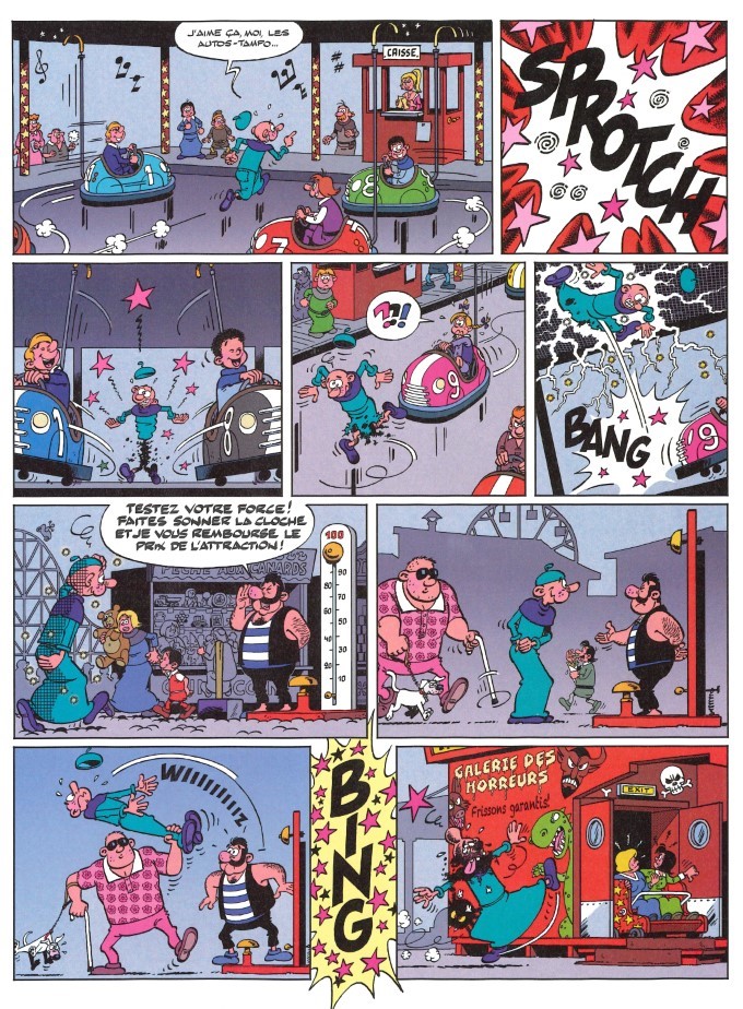 Pêle-mêle, le lecteur va donc découvrir les origines du baby-sitting, les analyses médicales, les bougies comestibles, la pêche au gros, le véganisme (hilarant), la clé à percussion et la robe de mariée. La robe de mariée ? Et oui, Léonard en pince pour Gigliola, la jolie voisine. Mais il y a un hic ! Elle est jeune, et lui plus vraiment. Disciple, lui, apprendra qu’on ne s’adresse pas de la même façon à Mozzarella et à son patron. « C’est quoi le mot magique ? ». Il ira aussi se détendre, ou pas, à la fête foraine. Ce sera l’occasion pour Turk de lui en mettre plein la poire dans une histoire texaveryssime. L’album marque aussi le retour des frères Schippatore, bandits de grands chemins. Pour terminer, un petit tour en Léonardmobile nous amènera à la campagne, dans la Siliconvali, où le génie prévoit d’installer le futur centre névralgique de l’innovation technologique.