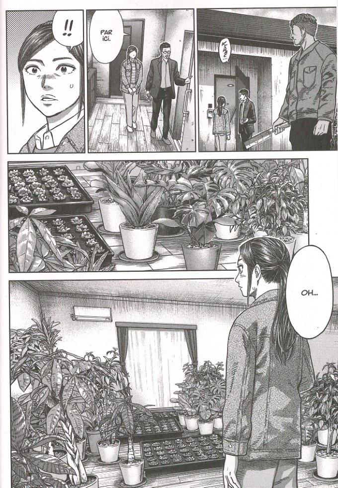 En cherchant son époux Morio, Madame Chitô ne savait pas qu’elle allait mettre la main dans un engrenage dangereux. Elle ne le sait toujours pas d’ailleurs, grâce à la malice de Kagayama qui va parvenir à l’enfumer au sens figuré du terme (pas mal pour une histoire de pétards) pour qu’elle reparte rassérénée. Il lui fait croire que son mari lui donne un coup de main dans la culture et le commerce de « simples » plantes vertes et que l’importante somme d’argent qu’elle a trouvé chez elle n’est que le fonds de roulement de leur entreprise. Elle ignore donc encore, et certainement pour son bien, que Morio met au point des pieds de cannabis d’une qualité exceptionnelle pour fournir une beuh tout aussi remarquable. Les premiers clients sont épatés. Ils surnomment Morio King. Le fleuriste va tout faire et plus encore pour être à la hauteur de ce sobriquet.