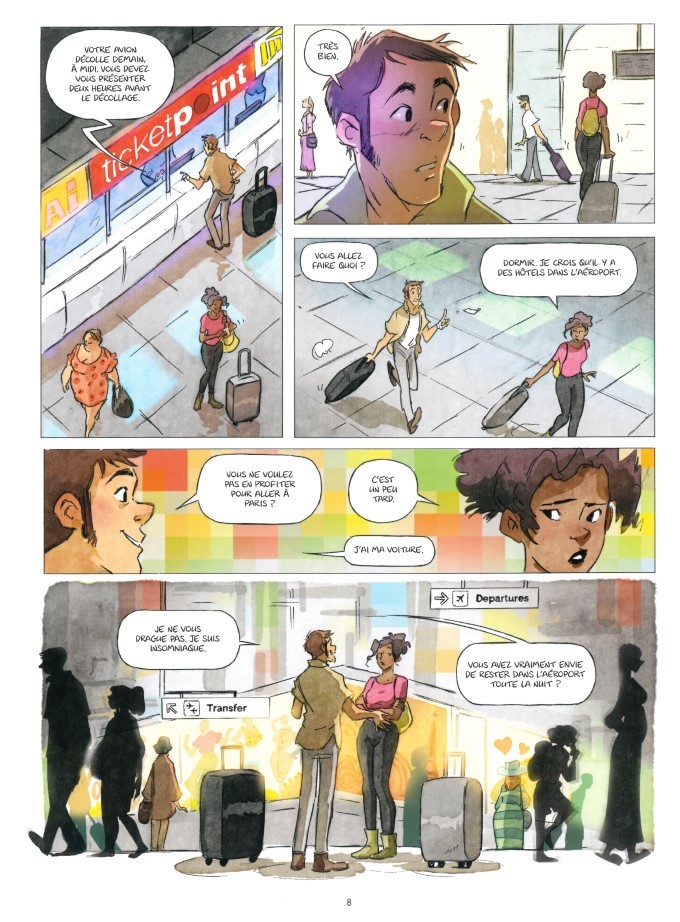 Un homme et une femme qui ne se connaissaient pas ratent tous deux le même avion. Il y a une toute petite chance d’y avoir de la place dans le suivant, si des retardataires ne se présentent pas. Jusqu’au dernier instant, l’espoir… Pfff !… Puis l’envol…de l’espoir. Les deux inconnus vont devoir attendre jusqu’au lendemain midi. Alors qu’elle s’apprête à aller prendre une chambre dans l’un des hôtels de l’aéroport, il lui propose d’aller faire un tour à Paris avec sa voiture. Il ne la drague pas. C’est juste qu’il est insomniaque. Elle propose une visite du cimetière du Père-Lachaise. Mince ! Elle a oublié qu’il était fermé la nuit. Qu’à cela ne tienne ! Ils vont faire le mur. Elle rêve de revoir la tombe d’Oscar Wilde qu’elle venait embrasser ado, les lèvres maculées de rouge, avec une copine pour célébrer la liberté d’aimer. Quelle déception ! Ils ont mis un vitrage sur la partie basse pour éviter les baisers.