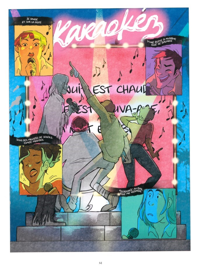Un vrai-faux loser, une super danseuse, un quasi-fantôme et une pharmacienne phénomène, quatre personnes, quatre destins qui n’auraient jamais dû se croiser, et pourtant… Les voilà réunis pour faire face à leurs passés, pour retrouver un sens à leur vie… ou à leur mort. David Graham écrit une quête de sens pour un quatuor en peine. Le fantôme d’Oscar Wilde est le d’Artagnan de trois mousquetaires vivants perdus dans la nuit, dont on ne connaît pas les prénoms, ce n’est pas anodin, et qui refoulent leur souffrance. Après Les vies de Charlie, Aurélie Guarino met de nouveau son émouvant graphisme au service des âmes. Formidable coloriste, elle met en scène les lumières de la nuit, des allées du Père-Lachaise jusqu’aux boulevards parisiens. Le parvis de l’Opéra Garnier est le théâtre d’une scène hors du temps. Peu à peu, la nuit laisse place au petit matin. L’occasion pour l’autrice de déployer un nouveau panel colorimétrique.