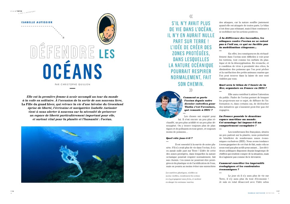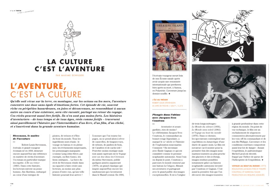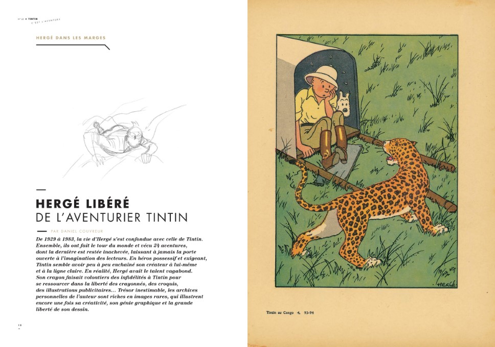 Comme d’habitude, tous les articles sont illustrés par des images de Tintin et les sujets replacés au cœur de ses aventures. Dans la rubrique Panorama, on se demande entre autres si des animaux d’espèces différentes peuvent communiquer. C’est l’occasion de revenir sur l’inimitié entre Milou et la pie voleuse des Bijoux de la Castafiore. Dans un sublime portfolio, on (re)découvre un Hergé au crayon vagabond, à travers les archives personnelles de l’auteur : images de Tintin évidemment, mais aussi illustrations pour des livres, croquis de recherche… et papier peint ! L’essentiel du recueil est consacré aux Tintin d’aujourd’hui, ces aventuriers, nourris ou pas par les aventures du reporter, mais marchant tous sur ses pas… pour de vrai.