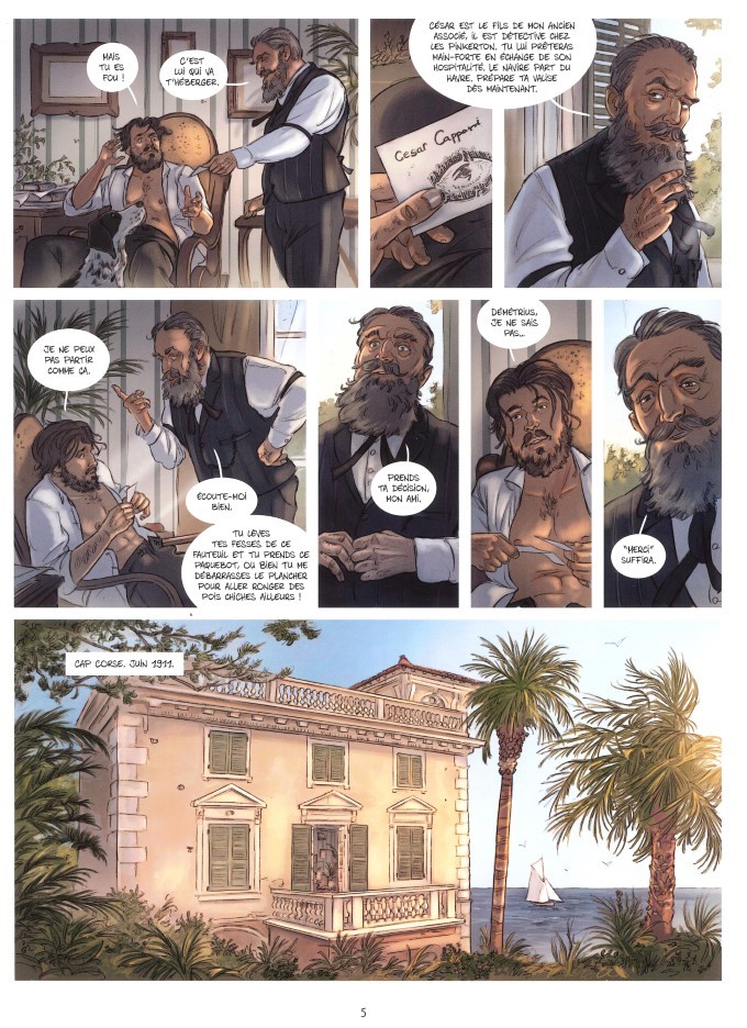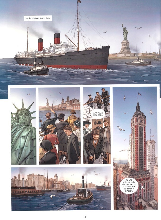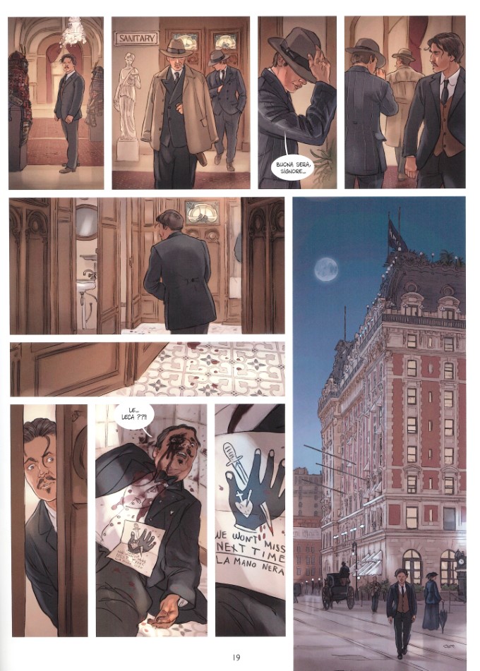Le Beaver building new-yorkais trône en couverture. Des villas somptueuses du Cap Corse aux gratte-ciels imposants de l’Amérique, Victor Lepointe s’applique pour des décors minutieux. Quel grand écart à côté de ces organes qui dégoulinent lors de l’autopsie d’un cadavre. Les couleurs ambiance sépia sans l’être vraiment immergent dans l’époque, dans un rouge feu succédant à la dominante bleu eau de la crue de la Seine.