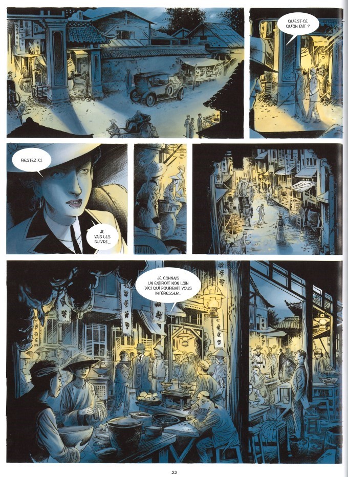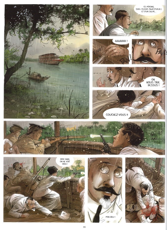 Voici donc le chirurgien embarqué pour l’Asie en compagnie de son fidèle assistant Guerlet, fidèle mais pas convaincu de l’intérêt de dépenser de l’énergie en Indochine alors que l’Alsace-Lorraine est à récupérer. Tout le monde ne sera pas ravi de voir Truc arriver à Saïgon. Après un traquenard raté en sortant de la fumerie d’opium Le Lotus Bleu, puis un autre sur le fleuve Mékong, le professeur atteint Phnom Penh. Au palais, en habits d’apparat, le Roi fume sur son trône. Une panthère noire pose avec fierté à ses côtés. Des musiciens accompagnent des danseuses, dont Simala, la favorite du Roi, aux dents teintes en noir, signe de grande noblesse et de séduction. Une fois le spectacle terminé, voici l’heure des présentations. Le souverain est très inquiet. La tâche ne va pas être simple pour Hermentaire Truc qui va devoir composer avec la crainte du Roi et les manigances allemandes qui vont tenter de faire échouer l’entreprise.