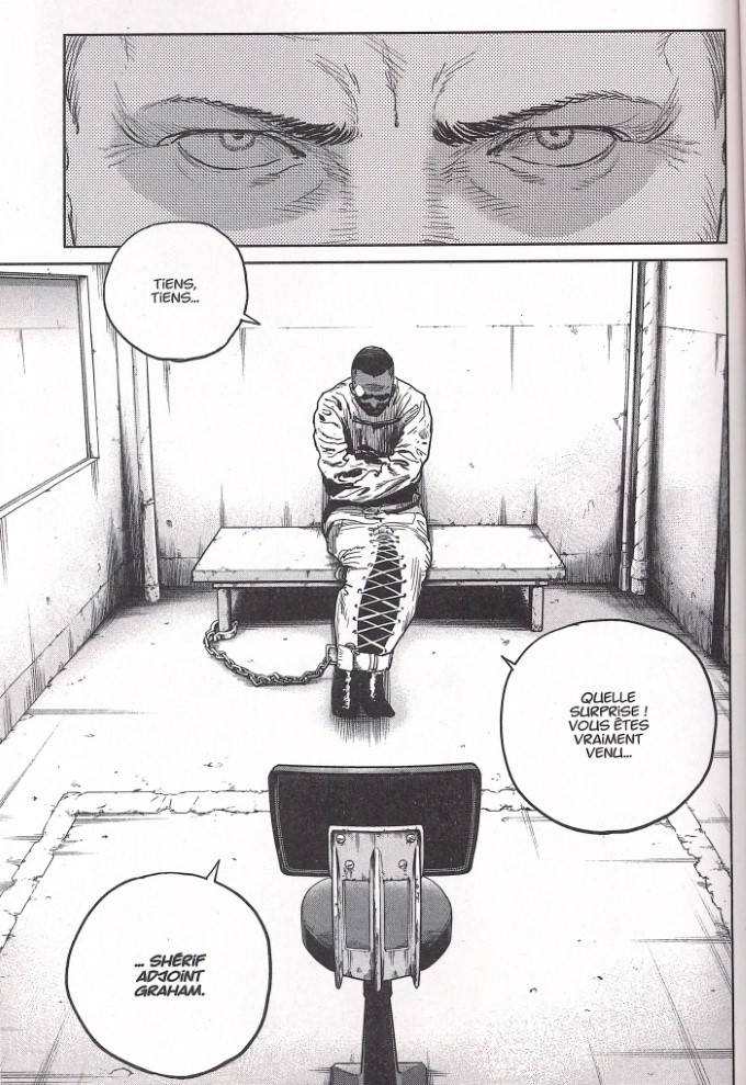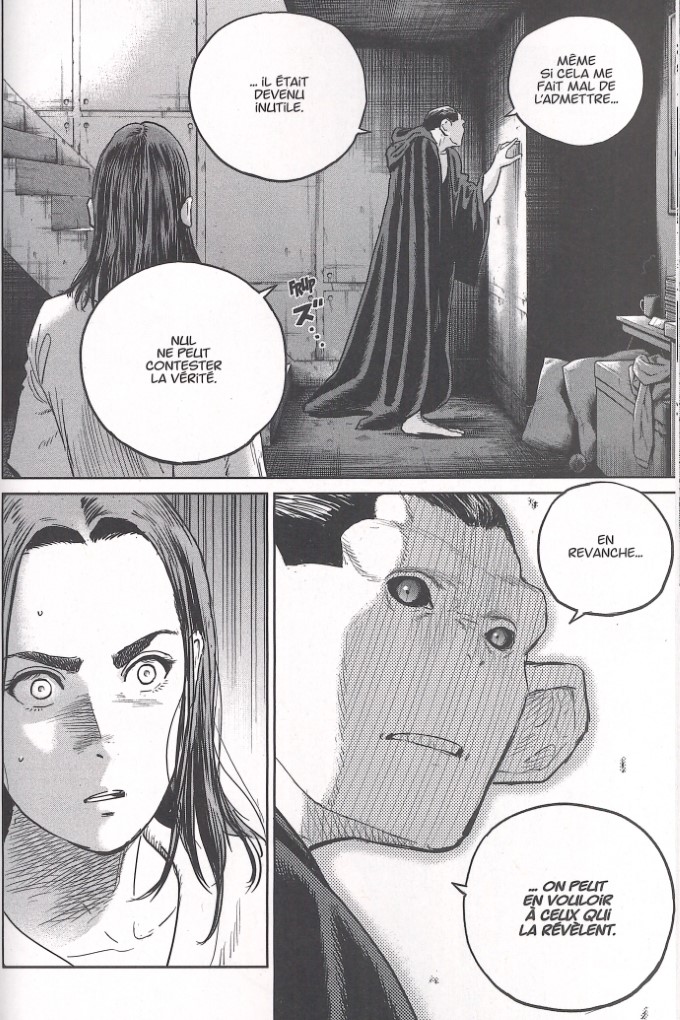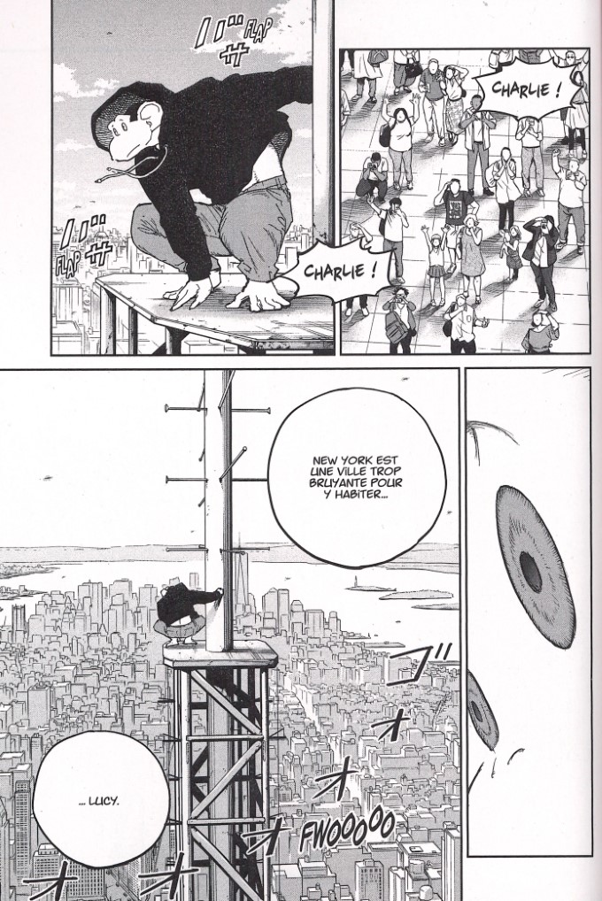Les cartes ont été rebattues pour ce huitième épisode de Darwin’s incident. Plus personne n’a vraiment la main sur la suite des événements. Si Omelas a une petite longueur d’avance, il est loin de posséder toutes les clefs pour arriver à ses fins. Shum Umezawa introduit un nouveau personnage truculent en la personne de Gonzales. (Mais vous pouvez m’appeler Gonzo !) Conseillé par la député Linares qu’il a rencontrée quand elle est venue faire un discours près de chez lui avant les élections, il enseignait autrefois la chasse aux touristes, la seule activité qui rapportait un peu dans son bled. Depuis, il est devenu végane et a commencé à travailler pour elle. C’est pour cela qu’il escorte Charlie qui a rendez-vous avec la professeur Yuan.