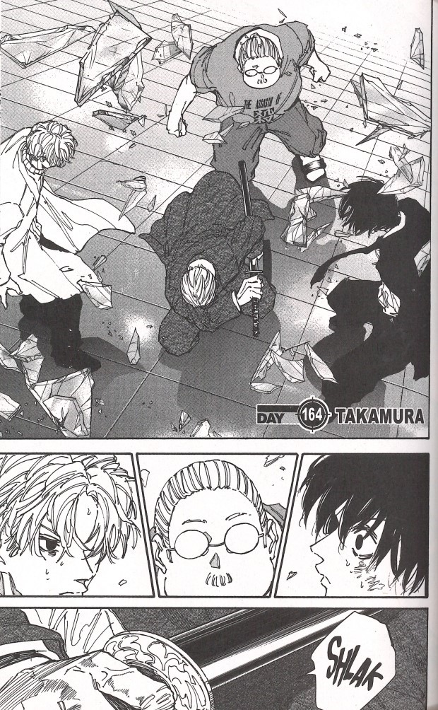 La bande de Slur a débarqué en hélicoptère au Musée. C’est dur à avaler mais leur projet d’attentat à la bombe n’était qu’une feinte. La fédération nationale des assassins (FJA) ne reculera devant rien pour les éliminer. Tôt ou tard, des visiteurs innocents seront pris dans des tirs croisés, et ça, pour Monsieur Sakamoto, c’est inenvisageable. Natsuki va débloquer les issues pour évacuer le public pendant que Shin et Sakamoto retiendront l’ennemi. Slur est arrivé avec quatre de ses agents, tous plus forts les uns que les autres. Hormis Slur, il ya Gaku, un combattant puissant qui a déjà quasi détruit une antenne de la FJA, Kumanomi, une experte en magnétisme qui a perdu un bras au combat mais qui l’a déjà remplacé par une arme, Kashima, un homme-cerf qui cherche à sortir son maître de la spirale de la violence, ainsi que Haruma.