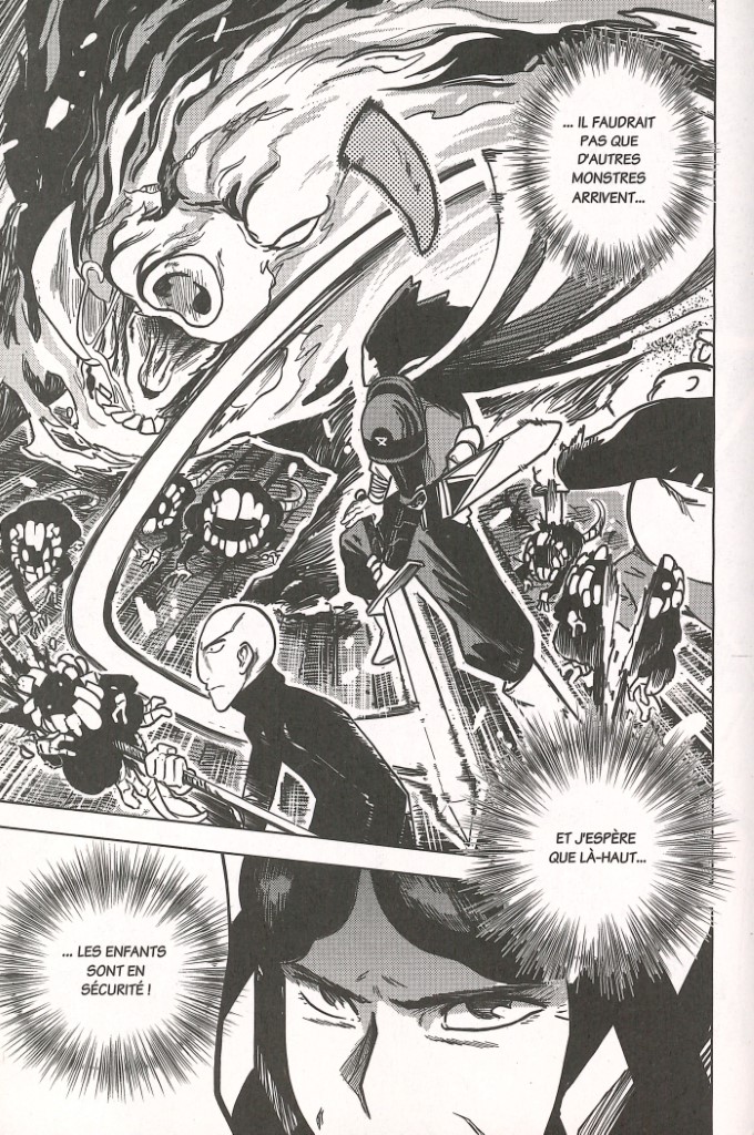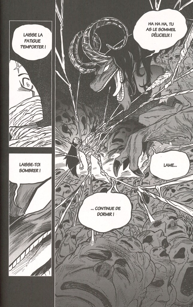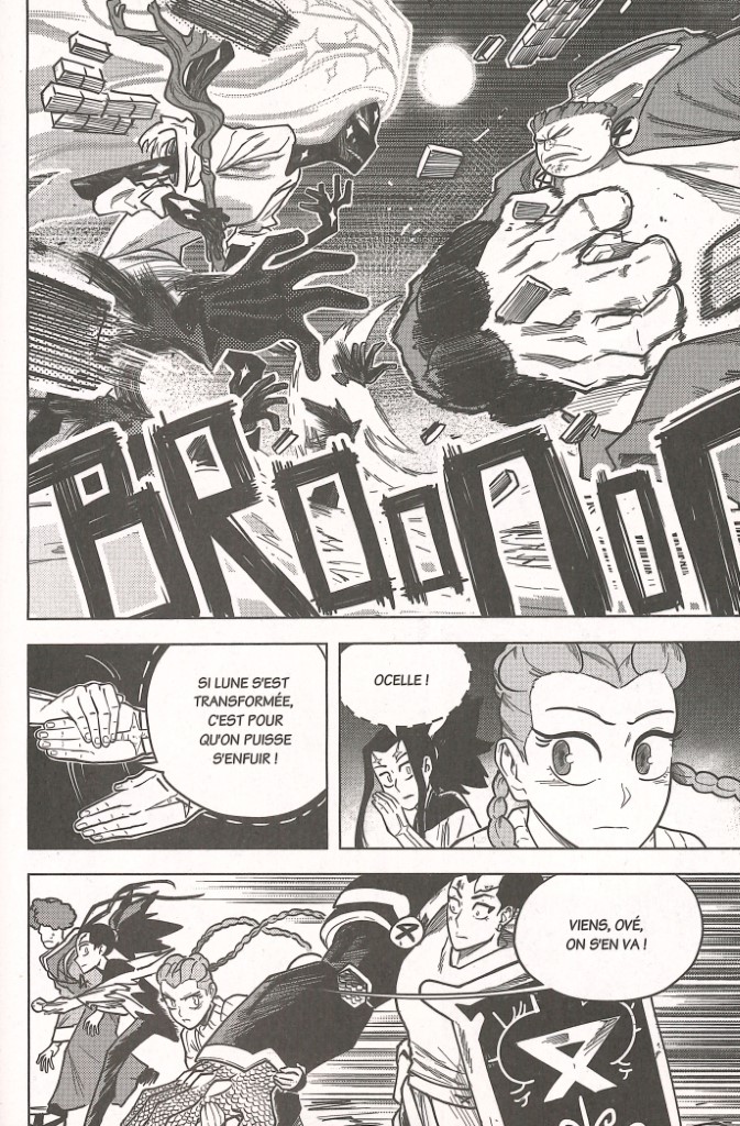 « Alors qu’au sein de la cathédrale, nos amis étaient pris en tenaille entre Hêtre et Cime, Lune décida de tenter le tout pour le tout et d’utiliser son pouvoir sur elle-même pour s’endormir. C’est ainsi qu’elle s’est transformée en monstre. » C’est ainsi qu’en préambule, un père rappelle à ses enfants où l’on en est dans l’histoire. Ové a l’air encore sonné. Ocelle arrive à la rescousse. Le ciel est fermé. Pour l’instant, les moines et les chevaliers tiennent bon, mais il ne faudrait pas que d’autres monstres arrivent. Lame s’interroge. Si Lune s’est transformée, ne serait-ce pas pour que ses compagnons puissent s’enfuir ?
