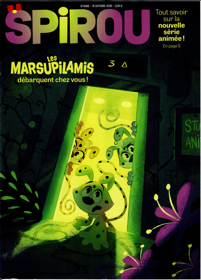 Quand Seccotine est revenue de son reportage en Palombie avec Le Nid des Marsupilamis, elle ne se doutait certainement pas que ces animaux amphibiens deviendraient plus tard des stars de la bande dessinée, du cinéma et de la télévision. Cette fois-ci, ce sont les petits Marsus qui sont à l’honneur de la nouvelle série télé qui va très prochainement débarquer. Twister, Punch et Hope sont les nouveaux héros, différenciés par leur couleur pour la nouveauté, de cette nouvelle mise en lumière des bestioles. Ça va bondir dans tous les coins de l’écran, et cette semaine dans de nombreuses pages du magazine.