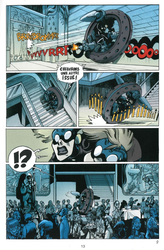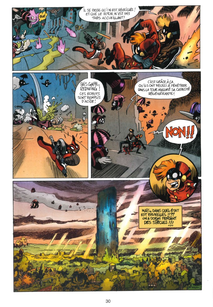 Fabien Vehlmann et Yoann dénoncent les dangers et les dérives de l’IA. En faisant faire un bond dans le temps à Spirou-SuperGroom, ils se projettent dans les progrès attendus de l’intelligence artificielle et mettent en garde la jeune génération. Après un gel de 10 ans, Spirou va se trouver face à un Fantasio pour qui le temps a passé, et un Comte dans un autre état. L’aventure est bourrée d’action, mais est aussi émouvante. On n’attendait pas, on n’attendait plus une telle puissance dans SuperGroom, et c’est arrivé. Le twist final est un peu basé sur le même principe que le succès cinématographique L’amour ouf. Il y est question de destin et de rendez-vous, avant une case prometteuse vers des aventures que nous ne lirons pas.