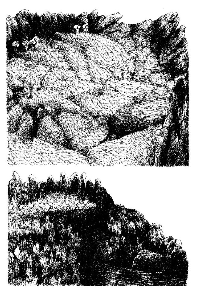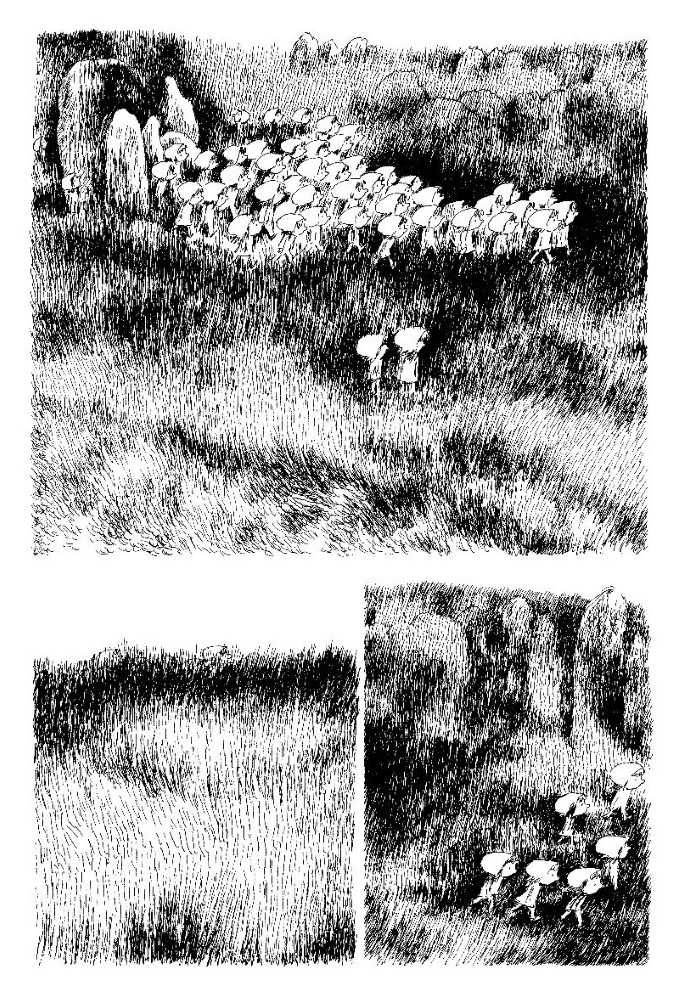 Parmi les hautes herbes et les pierres levées, un groupe de petites filles, telles des lutins, avancent dans la campagne, traçant des sillons au fil de leurs pas, en ligne ou par parquets. Elles atteignent les falaises de bord de mer. Ce sont les Julys. Elles chantent sans ouvrir la bouche des mélodies voluptueuses. Elles traversent les pages et les paysages. Elles ne font qu’un avec la nature. Pas encore là en juin, elles sont déjà reparties en août.