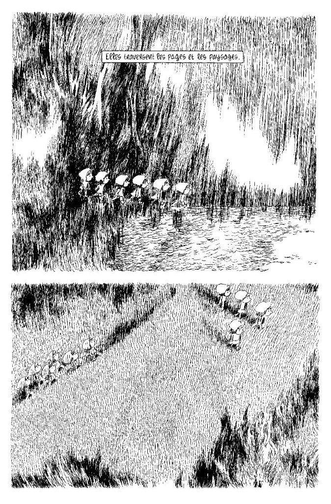Les Julys n’est pas une histoire. Les Julys n’est pas un reportage. Les Julys n’est pas une chronique de vie. Les Julys, c’est une poésie dessinée. Ode à la nature, ode à la solitude (« C’est beaucoup mieux seul. On a pas de problèmes avec les autres, on peut vivre à son rythme… »), ode à la création et à la paternité, Nylso écrit ni plus ni moins qu’une fable sur le sens de la vie. Tantôt en colonne comme les fourmis, tantôt en paquet comme les sardines, les Julys avancent sans but précis. La seule chose qu’elles savent, c’est qu’il faut y aller. Où ? Quand ? Comment ? Ça, elles le découvriront au fur et à mesure de leur avancée, sous les regards du papa et de son fils. Ce papa, est-ce Nylso lui-même ? L’auteur entretient le doute quand une July trouve son carnet à dessins. Quand elle va décider de dessiner dessus, à quel moment sait-on si le livre que l’on tient dans les mains a été réalisé par Nylso ou par une July ?