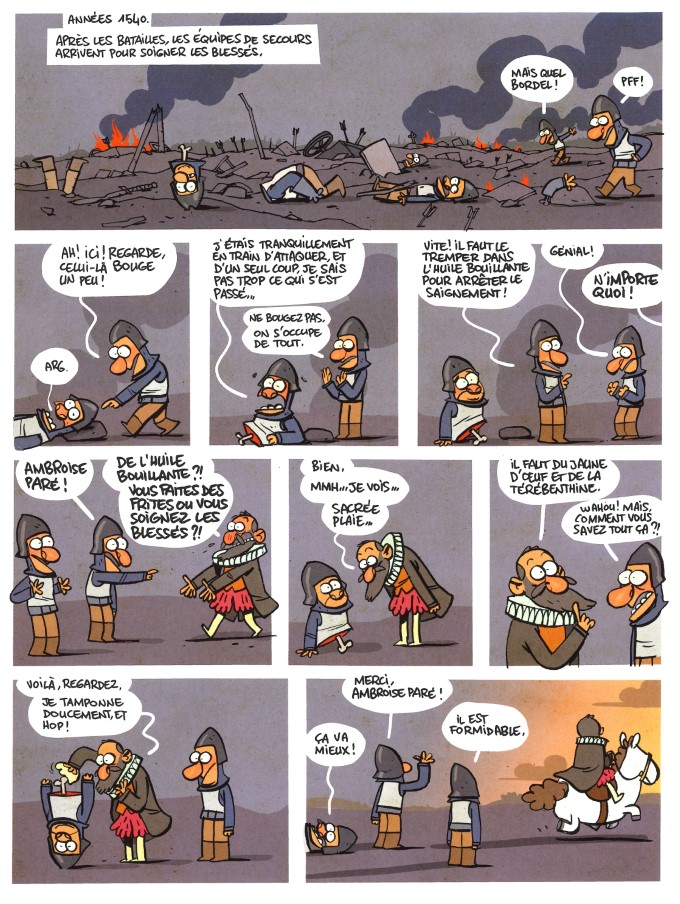 « -Oh bordel… Bon, ok. Effectivement, soigner à l’huile bouillante, ça se faisait, et effectivement, Ambroise Paré préconisait des traitements moiiins… Galilée, ok, il a eu des problèmes avec le pape. Mais qu’est-ce que c’est que ces conneries, après ?! Ça va pas la tête ? …Et Cugnot avec sa voiture, là ? Sérieux ?! Les Montgolfier on va passer vite fait. C’est n’importe quoi. Et la pile de Volta qui fait exploser les gens… Je… Il va falloir vous reprendre. «