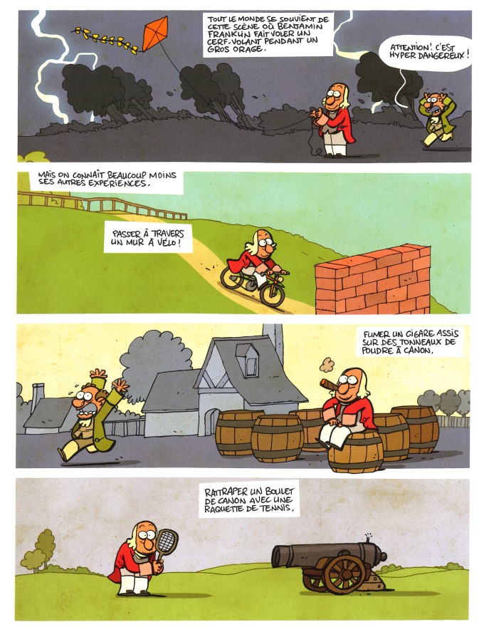 On présente Claude Chappe, concepteur du télégraphe, le premier à révolutionner la communication à distance. On ne présente plus Isaac Newton, ni Benjamin Franklin. Si le premier aurait pu inventer la tarte Tatin, avec son gâteau qui tombe retourné sur le sol, le second tenta des expériences autrement plus périlleuses que de faire voler un cerf-volant un soir d’orage. Quand Graham Bell inventa le téléphone en 1876, il ne se doutait pas qu’il allait être la première victime du démarchage. Il s’en branle de changer ses fenêtres ! Tout au long de l’album, vingt-deux créations passent ainsi au prisme Libon, avec tout le sérieux (hum !) qu’on lui connaît, un véritable cavalier de l’apocadispe de la vérité historique. Mais dans le fond, il y a toujours une part de vérité.