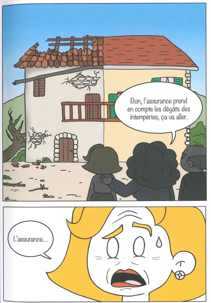 « -Ah cette tempête, elle en a fait des dégâts ! Mais bon, votre toit était déjà en mauvais état. Là, au moins, vous serez tranquille pour une bonne cinquantaine d’années.