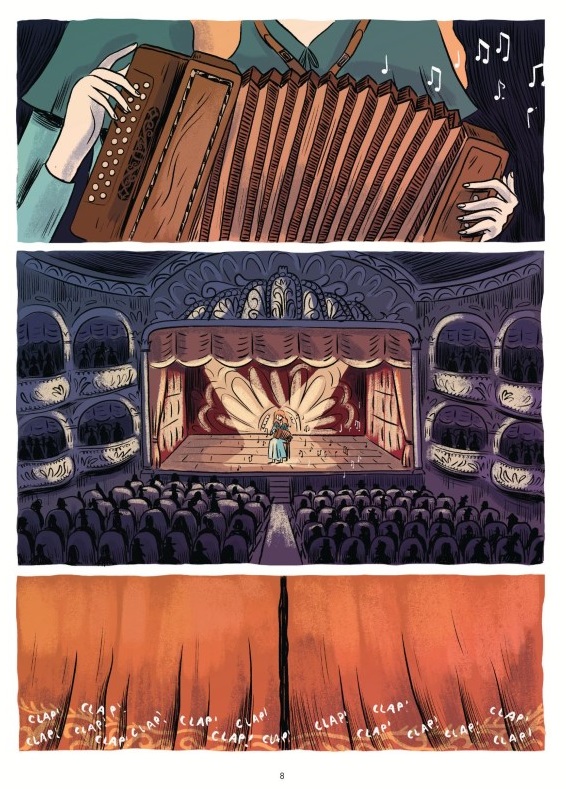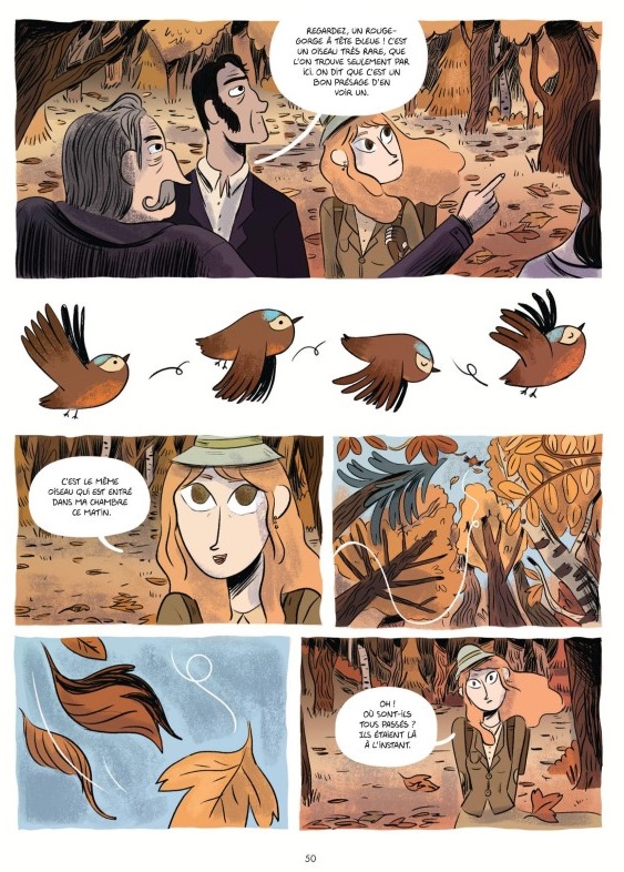 Tombée sous le charme des montagnes de Bagnères-de-Luchon, l’autrice espagnole Anna Aparicio Català y a trouvé un cadre élégant et mystérieux, au passé riche d’une époque mondaine révolue. Elle a tiré de cette beauté isolée ce conte féérique dans lequel on ne sait pas s’il faut avoir peur pour Amandine ou pas. Qu’attendent d’elle exactement les villageois ? Anna entretient le suspense le plus longtemps possible dans cette histoire de transmission. Ses personnages aux yeux gigantesques à la Yomgui Dumont sont des passeurs d’émotion. Ses décors automnaux arrondis sont de la plus grande délicatesse. Entre réalisme et onirisme, l’histoire volète au son de la musique que l’autrice parvient à dessiner, à faire entendre. A écouter en lisant l’album, Marta Ledesma a composé un morceau spécifique téléchargeable grâce à un QR code qui se trouve en préambule.