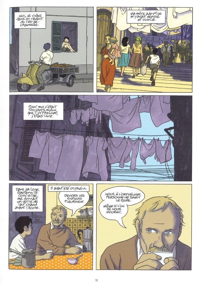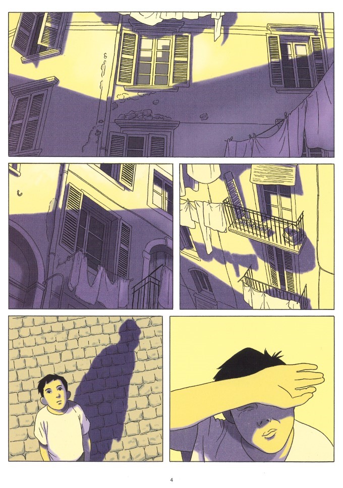 Marchant sur les pas de de Luca, Tronchet reste mystérieux quant aux intentions de certains personnages. Comme Erri, on est embarqué, envoûté, aveuglé par les événements, comme si le soleil qui pointait dans la cour nous tapait dans l’œil au point de ne pas voir réellement vers où l’on avance. Durieux dessine de grandes cases, ralentissant le temps, jouant du paradoxe avec une lecture somme toute rapide de l’ensemble, qui correspond au fait que, pour le garçon, tout va finalement très vite, sans qu’il ne se rende vraiment compte du piège du destin. Le jour, la nuit, du jaune, du bleu, du violet, avec quasi-uniquement trois couleurs, Durieux pose la palette d’une tragédie théâtrale à la Roméo et Juliette.
