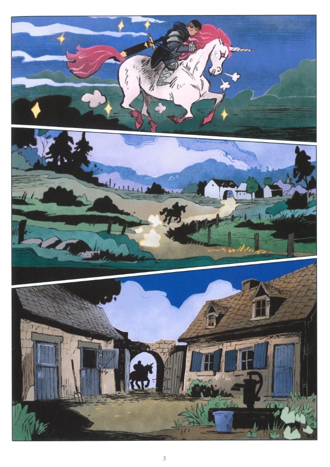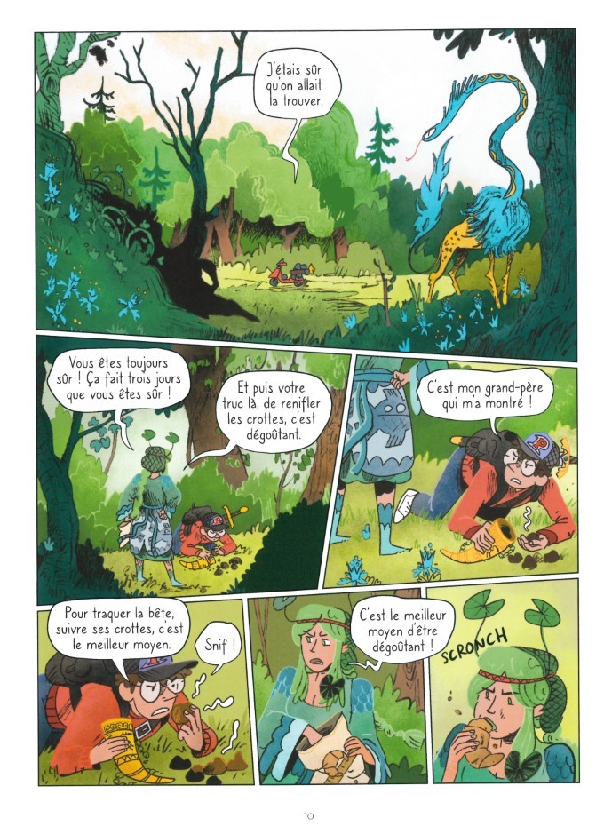 Accompagné de Nimué, la dame du lac, Pelli est à la recherche de la bête questante en pleine forêt. Pendant qu’elle grignote des croissants, il renifle des crottes pour traquer l’animal. C’est son grand-père qui le lui a appris. Un nouveau compagnon se joint à eux : un chien de chasse sans collier, certainement abandonné par son propriétaire parce qu’amputé d’une patte. De son côté, Gawain, le chevalier solitaire en quête de gloire, a mis un cône de fête sur la corne de sa licorne pour qu’elle passe inaperçue, surtout des hommes de Morgane Le Fey. Il faut dire que la traque de la bête recherchée depuis mille ans, depuis l’époque du roi Pellinor, ne plaît pas à tout le monde.