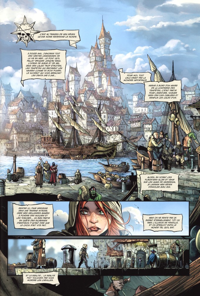 A douze ans, elle ignorait tout des vérités crasseuses de la vie en mer. Elle, ce qui l’intéressait, c’était servir à bord d’un navire de la confrérie des tempêtes pour partir à l’aventure et remplir les cales d’or. Y parviendra-t-elle ? En attendant, la vie va forger Agora, comme ce jour où elle échappera de peu au massacre de sa famille après que son père lui a offert un médaillon pas comme les autres, qui se confie de génération en génération. La gamine est sauvée in extremis par Thoorak, un orc imposant (pléonasme), qui met en déroute les assassins. Tout de suite, il la prend sous son aile et lui propose de rejoindre la confrérie des tempêtes, et en particulier les matelots de la lanterne, sur leur rafiot. Ce qu’Agora ignore encore, c’est que Thoorak ne se trouvait pas là par hasard. Agora n’a que sa vengeance en tête. Elle ne compte pas laisser impuni les crimes des siens.