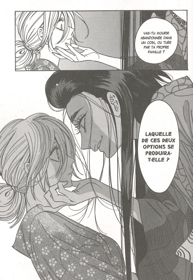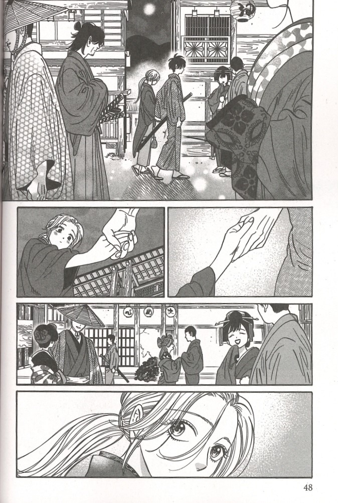 Dans Les noces des lucioles, la courtisane la plus prisée de la maison close vient d’arriver. Elle se nomme Asagiri. Elle vient rarement, ayant des amants aux quatre coins de l’île. C’est elle qui dirige l’établissement dans l’ombre, et non pas Mitsueda et sa bande. Sotako va tenter de créer un lien avec elle pour la convaincre de se faire acheter sa propre liberté. Asagiri connaît tout son passé : le fait que Satoko ait été amenée ici de force, qu’un membre de sa famille lui veuille du mal, et que de nombreux clients s’entichent d’elle. Tout cela, aucune autre courtisane ne le sait. Le secret sera bien gardé. A partir de maintenant, elle va confier à Satoko plusieurs tâches à accomplir. Si elle les mène à bien, elle reconsidèrera l’idée de se faire acheter sa liberté. Première mission : se rendre pour elle dans une échoppe de peignes avec Shinpei. Voilà déjà quelque chose que Kotaro, le garde du corps de la première heure de Sotako, ne verra pas d’un bon œil…