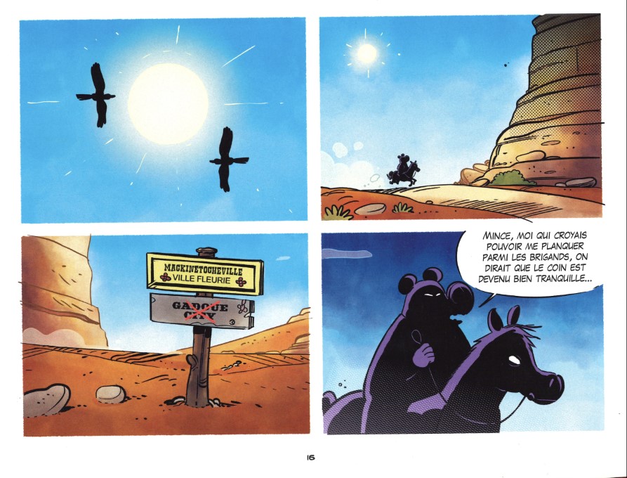Changement d’ambiance pour les trappeurs américains. A l’étage du saloon, Croquette se réveille et épingle son étoile de shérif. Après un bon p’tit déj’, il part patrouiller avec Mike, dans une ville qui se modernise petit à petit : rues pavées, trottoirs aménagés, … L’or des frères Mackinetoche a été utilisé à bon escient. Pourtant, une menace plane sur la cité et personne ne s’en doute. Le terrible bandit Norman Nobody s’apprête à arriver en ville. A une cicatrice près, il ressemble comme deux gouttes d’eau à Mike. Et que va faire le fourbe ? Subtiliser son identité bien sûr. L’or de la banque est en danger.