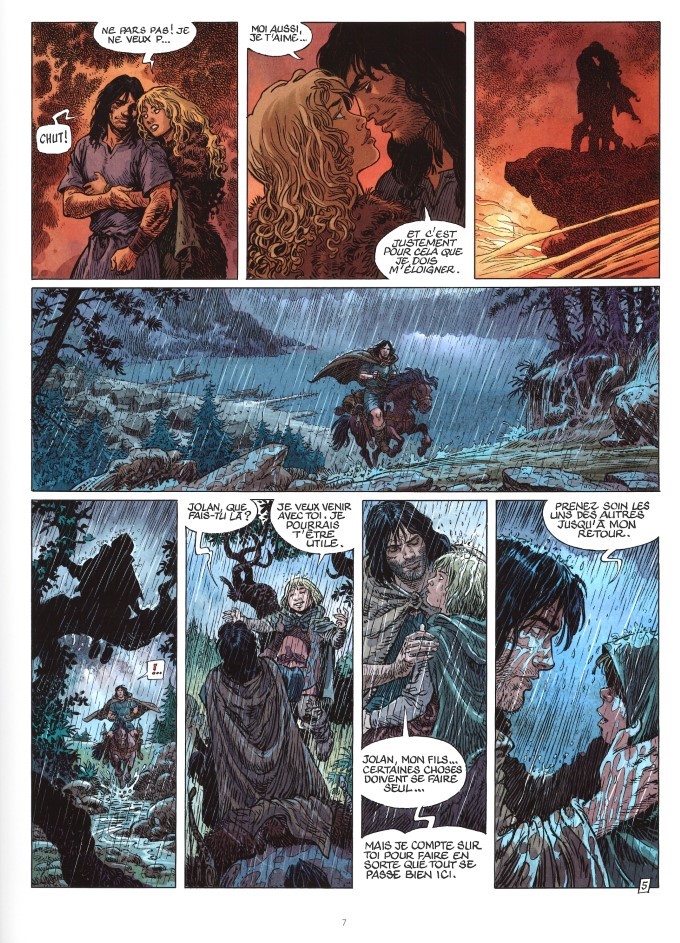 C’est déjà le cinquième one shot Thorgal Saga. La série parallèle est toujours aussi fidèle à ses origines, mais attention de ne pas en faire trop. Tant que ce sont des albums de la qualité de celui-ci, on peut y aller. Antoine Ozanam ne s’embarrasse pas à trouver un prétexte au départ de Thorgal du village. « Je doute qu’il existe une seule terre où je puisse me cacher des dieux. Mais peut-être pourrais-je au moins me faire oublier. » Il quitte sa famille parce qu’il les aime. C’est sûr, on fait tous ça… Bah, lui, il est héros de bande dessinée. C’est pour ça qu’il agit ainsi dans ce démarrage à la limite du parodique. Les choses sérieuses arrivent rapidement. Le scénariste rebondit sur deux albums : « Aaricia » et le mythique « Au-delà des ombres », épisode majeur de la Saga. Quel plaisir de retrouver Shaniah que l’on pensait perdue à jamais. Ozanam joue à fond la carte de la mythologie Thorgal dans un scénario taillé au cordeau. Au dessin, on retrouve le talentueux Mohamed Aouamri, qui rosinskise légèrement son trait, même si quelques cases ont l’empreinte de La quête de l’oiseau du temps, expérience dont on ne peut ressortir graphiquement le même qu’avant d’y avoir participé.