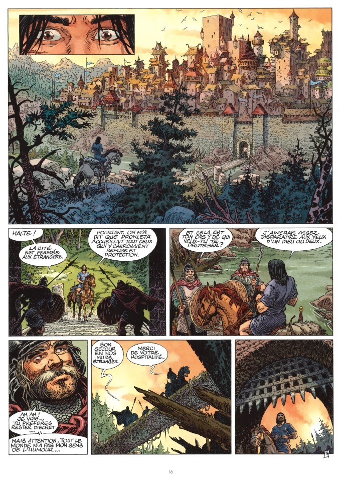 Arrivé sur place, Thorgal apprend que Prokleta n’est pas une ville comme les autres. Apparemment, on ne peut pas sortir de la forteresse quand on le désire, parce qu’elle est magique. Si on l’appelle la cité mouvante, c’est parce que lorsque l’on ferme ses portes, elle change d’emplacement. Un jour dans les montagnes, un autre dans le désert ou au milieu des glaces. Si l’on tente de la quitter par ses propres moyens, une puissante magie ramène l’éventuel fuyard en son sein. Thorgal va tenter l’expérience et constatera les faits. Y est-il enfermé à tout jamais ? Quel est le rôle de Shaniah dans l’affaire ? De son côté, au village, Aaricia reçoit la visite d’une de ses connaissances qui a bien changé, Vigrid, un compagnon de route de Thorgal, un dieu étonnamment serviable, qui compte bien profiter de l’absence de l’enfant des étoiles et dont il n’est pas étranger à son sort actuel.