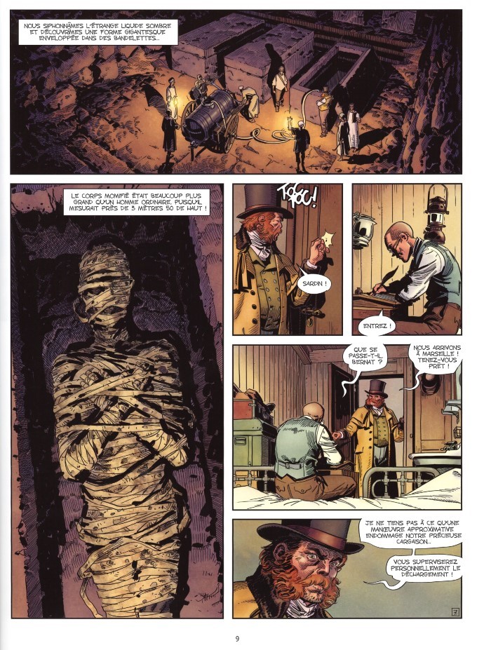 Egypte, 1869. Lors de fouilles archéologiques, sept sarcophages sont mis à jour. La découverte risque d’avoir un retentissement mondial. A l’intérieur, dans une puanteur épouvantable, une pâte visqueuse et noirâtre laisse place à un liquide épais et gluant. Une fois le premier tombeau siphonné, les explorateurs, Bernat et Sardin, découvrent un corps momifié de près de 3 mètres 50 de haut. Il va falloir le ramener à Marseille afin de l’autopsier dans les règles de l’art. Evidemment, la momie va susciter bien des convoitises. Pour les égyptiens antiques, la mort n’est pas une fin en soi, mais un passage, un trépas. C’est pour cela qu’ils préparaient les corps à leur rencontre avec Osiris, avec l’embaumement. Ce qui est bizarre dans le cas de la momie autopsiée par le duo de scientifiques, c’est que les organes n’ont pas été retirés, ni placés dans des vases canopes près du mort.
