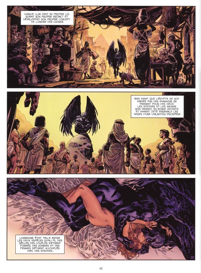 Corbeyran remonte aux sources des Stryges dans la mythologie égyptienne, jouant des hommes et des dieux. Nicolas Bègue représente l’Egypte et le Paris de la fin du XIXème siècle dans une immersion totale. Lucie Fabbro lie les deux endroits dans des tons de couleurs qui glissent de l’un à l’autre des lieux sans rupture. C’est presque étonnant comme ça passe. Comme pour rassurer les lecteurs, c’est Richard Guérineau qui signe la couverture. Bègue aurait très bien pu la réaliser lui-même. Enfin, dans un sublime cahier graphique, les dessinateurs partenaires du scénariste montrent leurs représentations des créatures.