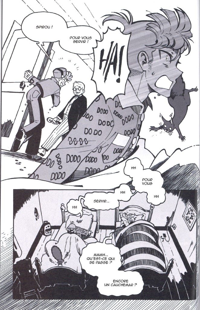 Un dessinateur asperge son œuvre qui prend vie. Spirou en jaillit et démarre sa carrière de groom. Rêve ou réalité ? Aujourd’hui, il se réveille au château de Champignac. Il vient encore une fois de rêver cette scène. Fantasio est dans le lit à côté. Ils ont promis au Comte de Champignac qu’ils auraient nettoyé le château avant son retour du congrès de mycologie auquel il s’est rendu. Il y a encore du boulot. Il reste les rosiers à tailler, les volets à repeindre et la bibliothèque à dépoussiérer. C’est dans ce lieu, pendant que Spirou récupère de sa nuit agitée, que Fantasio va trouver un livre qu’il va tenter de détruire. Spirou l’en empêche in extremis. Fantasio lui fait alors un aveu. Pour cela, il lui raconte leur première rencontre.