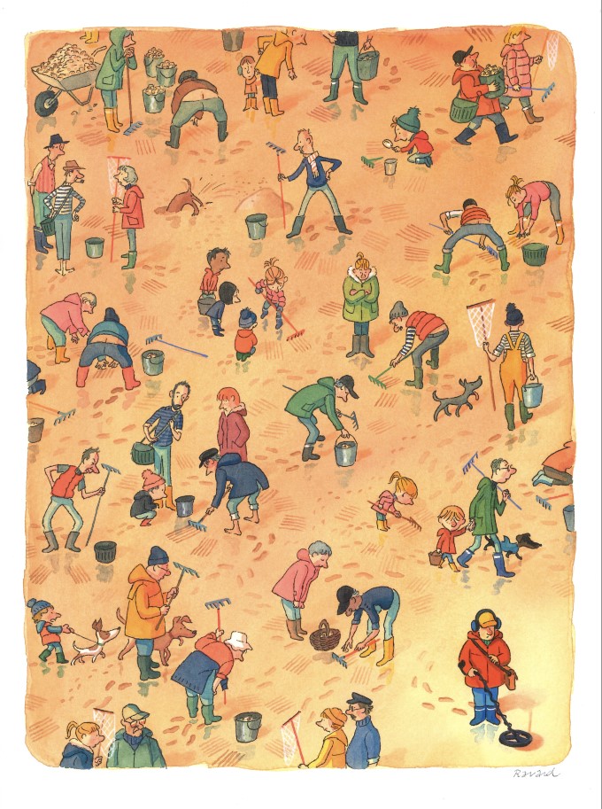 Les dessins ne sont pas alignés innocemment. L’histoire, si histoire il y a, se déroule du petit matin jusqu’au soir, jusqu’à la nuit même. Si l’on feuillette les pages à la manière d’un flipbook, les couleurs à l’aquarelle permettent de nous en rendre compte. On suit la journée mais on mélange les saisons. L’été, on fait du pédalo, l’hiver, on dessine une maison sur le sable. Ravard invoque Sempé tout autant que ces images de puzzles aux multiples personnages et saynètes. L’auteur réhabilite la Bretagne en lui offrant un écrin de tendresse. Si vous traînez du côté de Dinard, rendez-vous Galerie Alfred. Vous y admirerez ces illustrations…en vrai.