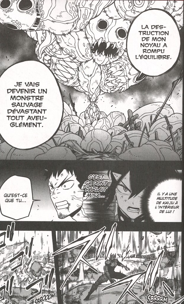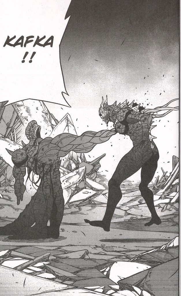 En plein combat contre le n°9, Kafka est envoyé avec son adversaire dans un monde parallèle. Il serait à l’intérieur de son ennemi. Le n°9 avoue son échec. Pour n°8, c’est du bluff. 9 est en train de se métamorphoser. Le phénomène est indépendant de sa volonté. La destruction de son noyau a rompu l’équilibre. Il va devenir un monstre sauvage dévastant tout aveuglément, comme s’il y avait une multitude de Kaïju à l’intérieur de lui. Il se mue en grand Kaïju de Meireki et frappe puissamment Kafka. Le noyau du n°8 est endommagé. Ses signes vitaux s’éteignent. Il va grandement avoir besoin d’aide.