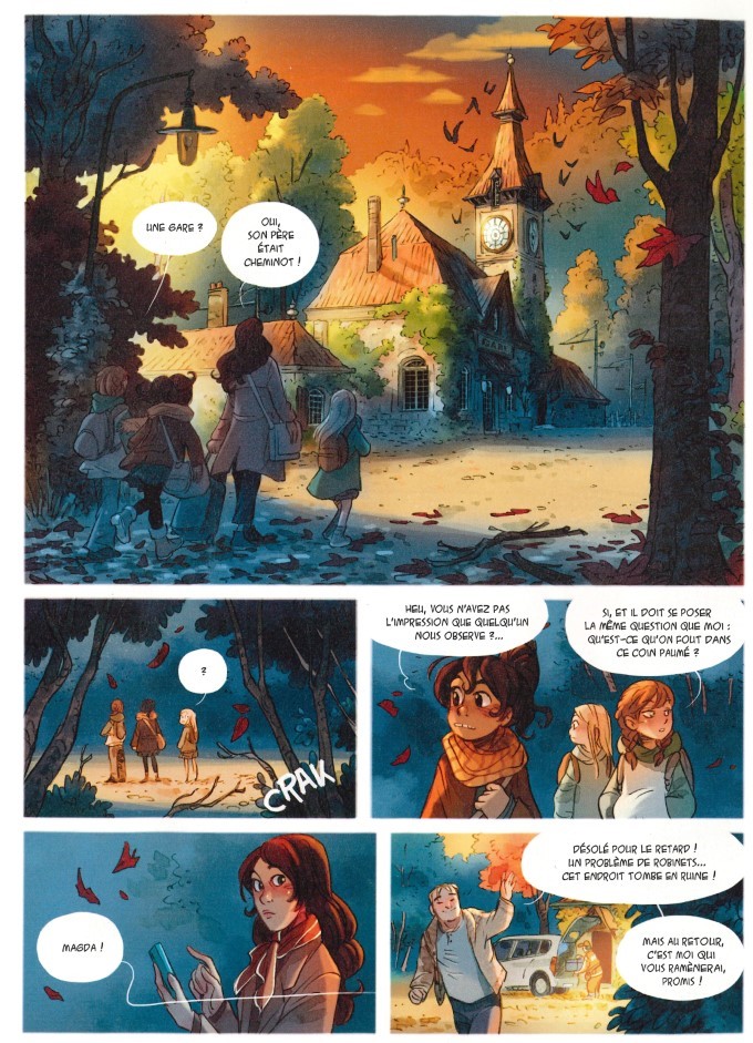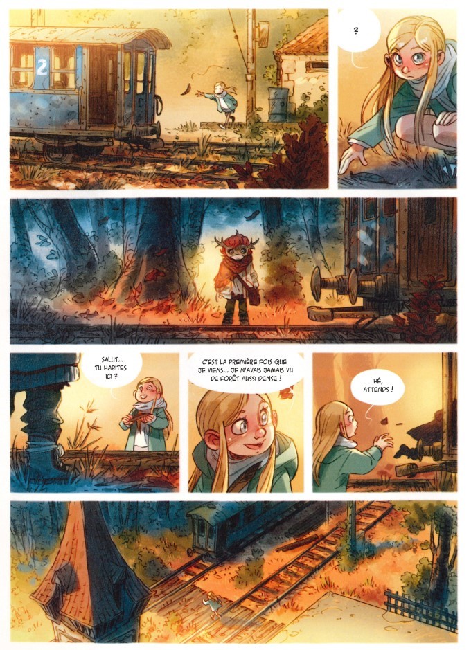 Enfant, Victor jouait avec son père au Liéchi malicieux, une sorte de chasse au trésor à l’envers dans laquelle il fallait remettre à leur place des objets, les uns après les autres, pour au final dénicher des bonbons. La légende disait que c’était le Liéchi qui organisait le jeu de piste. Le morceau de carrelage trouvé par Sarah au milieu de la maquette serait peut-être le début d’un jeu, une dernière piste laissée par l’homme de gare. Pendant que les adultes vont s’occuper de remettre de l’ordre dans la maison, voilà une nouvelle mission pour les sœurs Grémillet. Alessandro Barbucci et Giovanni Di Gregorio emmènent leurs lecteurs dans une ambiance automnale proposant autre chose que ce que l’on peut lire habituellement en période d’Halloween. Ils en gardent certains codes, comme la créature mystérieuse ou les lieux désaffectés, tout en y apportant leur touche qui caractérise la série. Barbucci s’est inspiré des décors des films Ghibli mêlés à une touche un peu creepy. La forêt est tout aussi inquiétante qu’accueillante. On y pénètre avec curiosité et une légère pointe de peur. Les auteurs inventent l’inquiétude rassurante. On sent même l’odeur des champignons des sous-bois.